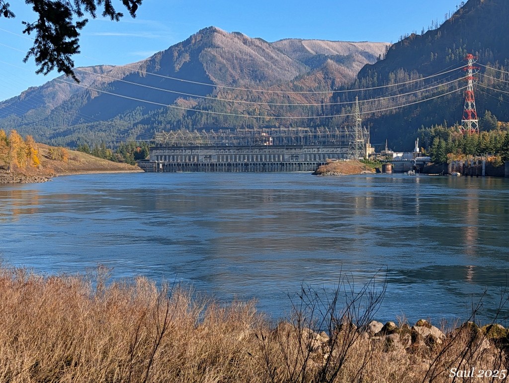 After lunch, we continued around the loop to a junction with a trail that went towards the Columbia River where we had nice views of Bonneville Dam. We took a trail along the river to the place where the Smolt Monitoring Facility returns the smolts to the Columbia River and stopped to identify the gulls resting on the structure and trying to catch the smolts in the river.