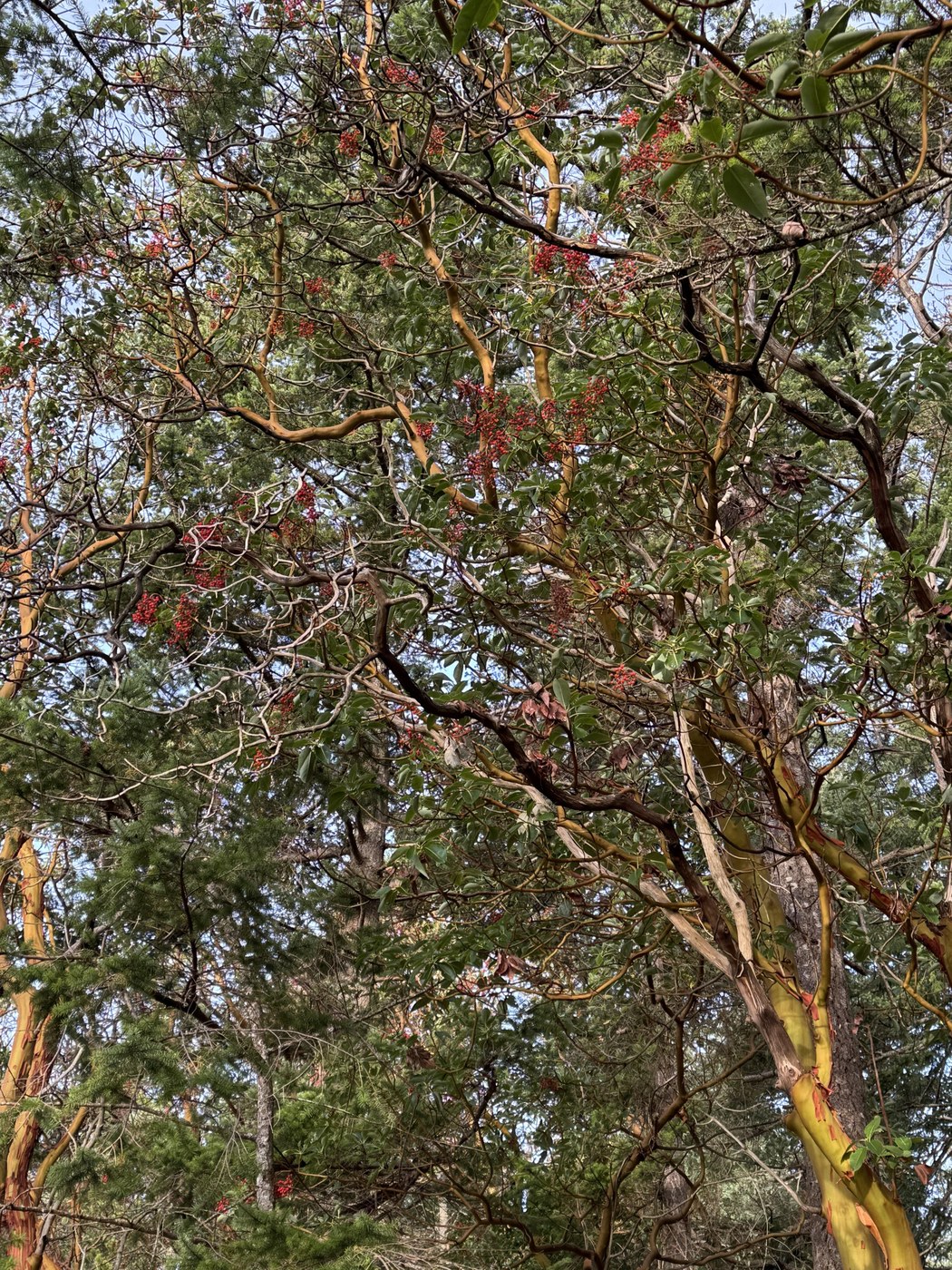 Lots of Madrone trees with their berries. These are visible on the ground, too, along with some fungi. You follow the signs to the Highlands Trail and to the parking lot to finish the loop. This involves a series of switchbacks uphill, but they level out about .6-.7 miles. You will border private land on this hike and there are several warning signs as you make your way back to the parking lot. The downhill is steep in a few spots, but doable.