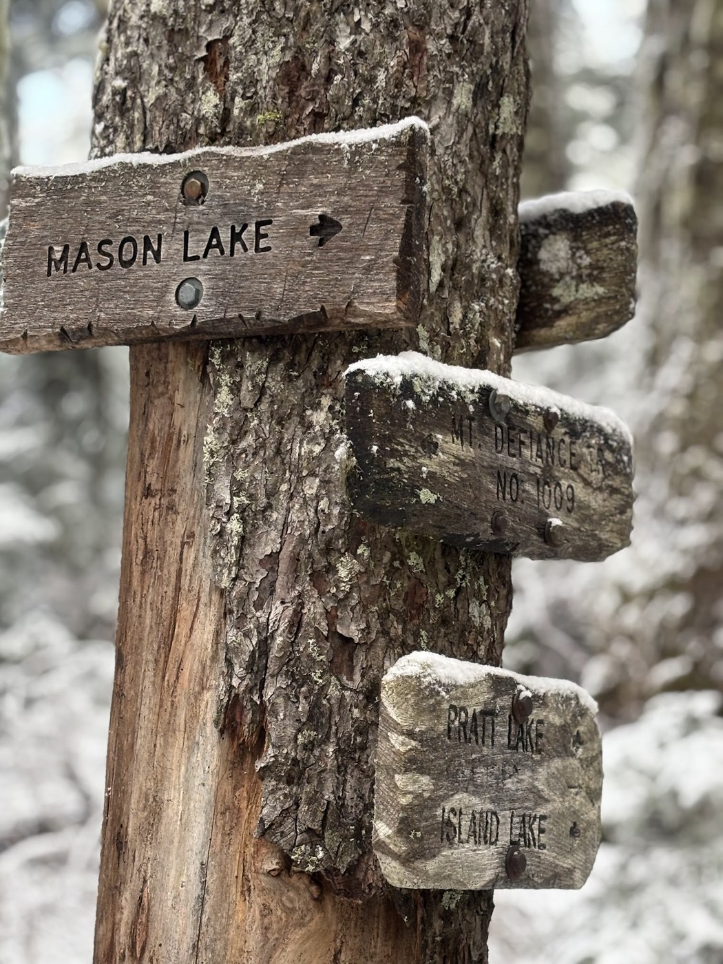 - The trail east of the Defiance turnoff was in lovely shape -- 2-3 inches of untouched snow on the trail. One of those "more comfortable in the snow than it would have been in the rain" kinds of days. Another trip reporter said it was quite mucky up there two days ago. The fresh snow cleaned that up for us, but I feel like that's a narrow window.