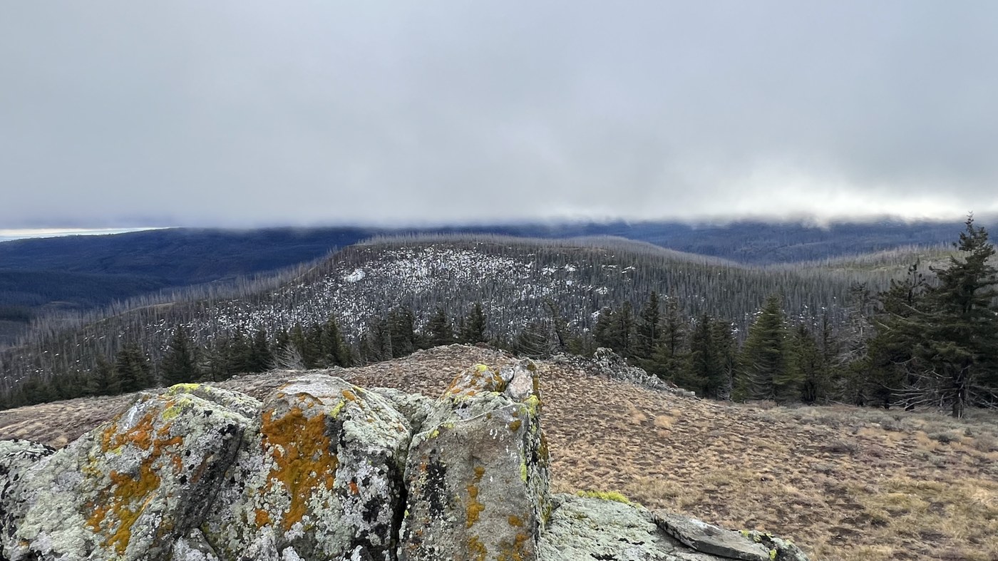 From the summit of Mount Lillian South, we again went cross country down some more open grass slopes avoiding the deadfall areas of the burn zone and caught the Liberty-Beehive Road, which we walked all the way back to the Tronsen Meadow Trail, and back to the car. Weather had got a bit better, so we caught a few glimpses of some sunset colors.