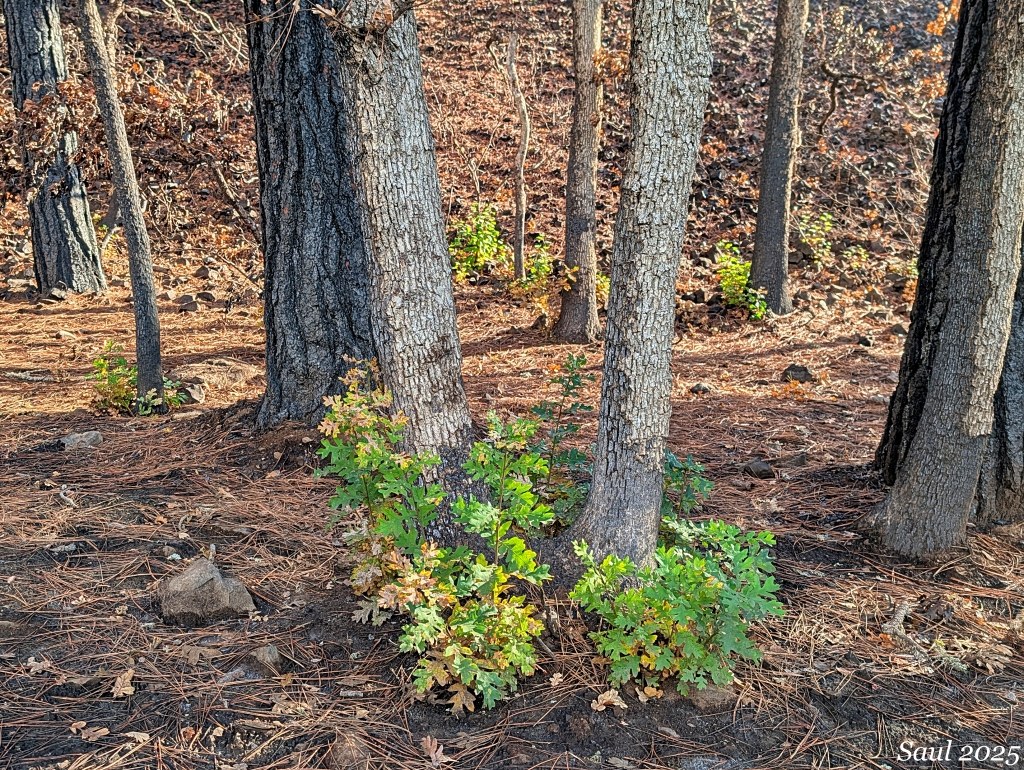 We noticed burned Oregon white-oaks resprouting from their roots. Some shrub species, like ocean spray, also were sprouting new growth from their roots.