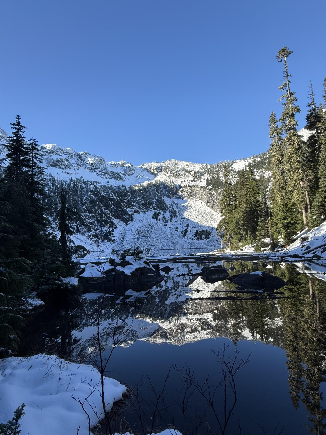The biggest obstacle is past Trout Lake. There are a few blowdowns, but one significant tree is blocking the trail completely. The trunk was too snowy and icy to climb over safely. Fortunately, previous hikers have established a bypass up the slope to the left of the tree. Take caution here—the bypass is steep, wet, and slippery.