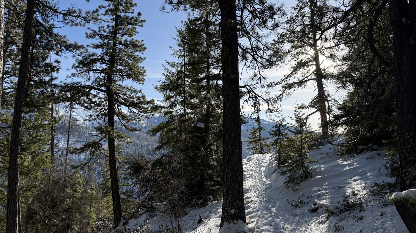 It was a beautiful sunny day over Blewett Pass. Parking lot is snow covered and groomed as the road up to trailhead. Some snowmobilers and sledding people and children in the first 15mins of the walk, and then noone on the actual trail. Trail is covered with a few inches of fresh powder, I had spikes but did not need them, not deep enough for snowshoes either. Nice view from the bench, lots of snow on the trees in the forest
