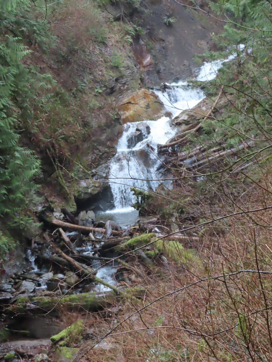 I then hiked to the end of the trail on the old railroad grade to the viewpoint where you can see the water of 15 Mile Creek roaring down some waterfalls. There is a bench located here. This area was also the location of the former coal mine coal loading facility where railroad coal cars would be loaded from the mining operation above. You can hike up to the coal mine entrance (now closed off) on a side trail.