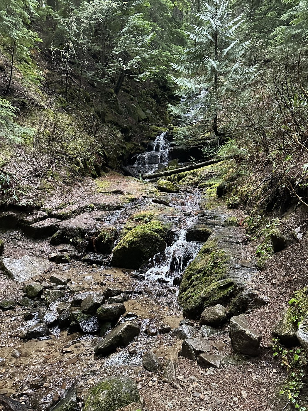 Aimed for a small window where the rain let up today. Only a few cars at the trailhead this afternoon. Trail holding up well in all the rain. Only a few mud patches. Trail to Ollalie Lake mostly still snow free. A few patches near the lake, but very light. The only problem posed was some icy patches on rough hewn board walks just under a mile from the lake. They were slippery in spots, but poles helped. Arrived at lake around sunset. Lake had light layer of ice on it with water on top. Temperature dropped quite a bit after sunset. Hiked back with headlamps. Trail is doable in the dark if you have proper lighting.