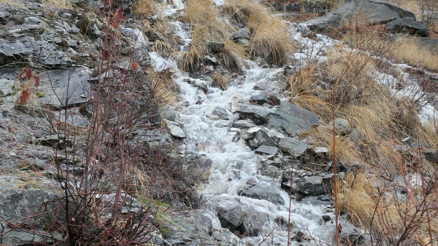 After the pond, there was one more trail junction with another trail up to the logging roads. Then the steep descent started alongside a stream, as did the rain! In one place, the stream formed a multichannel waterfall over the trail. Most of the descent was in good condition, but there were a few more places with substantial water flowing along and over the trail.