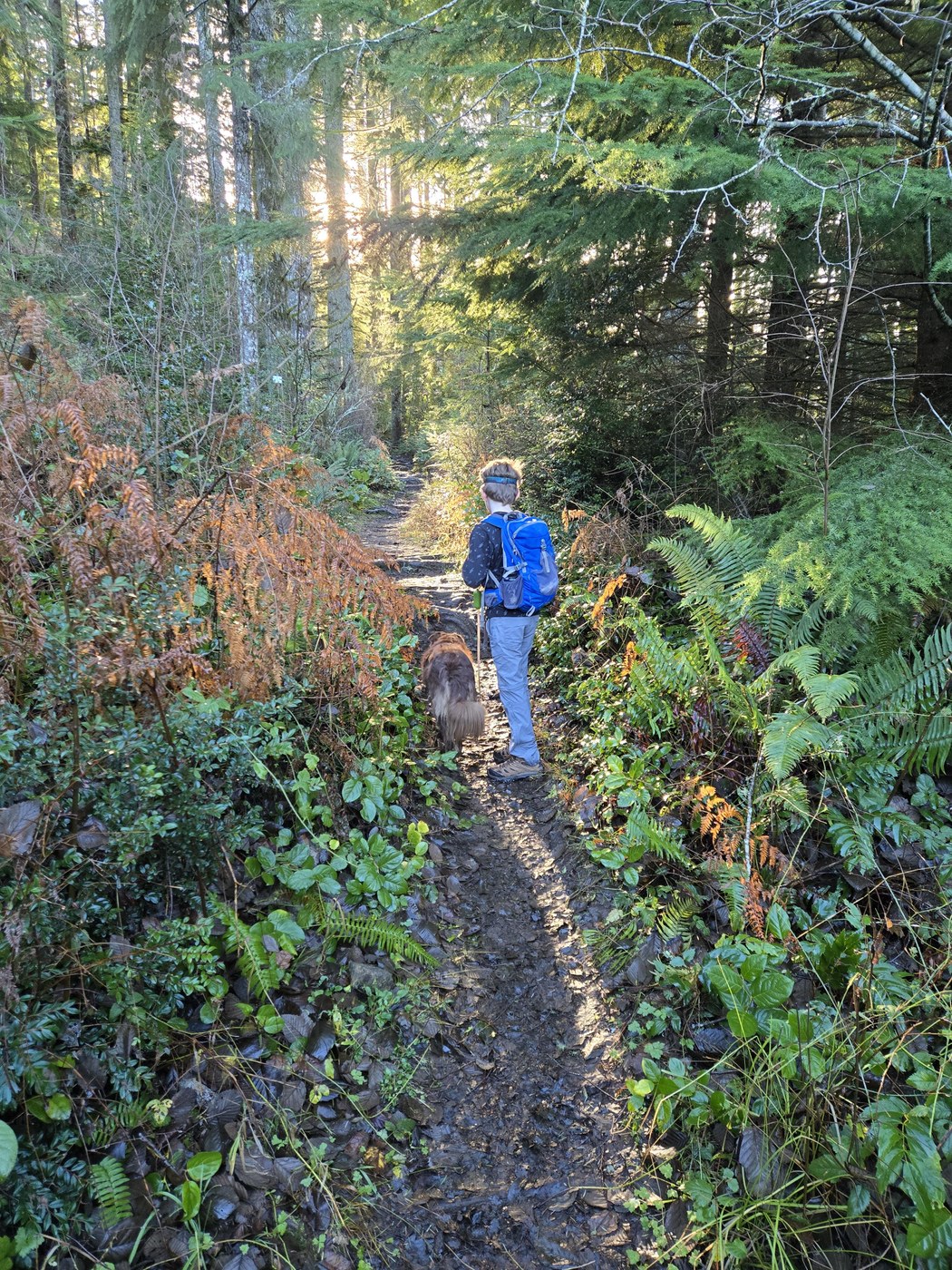 Lots of water running on the trail, we were glad to have high top boots. One recent tree across the trail. My son went over it. The dog and I went under it.