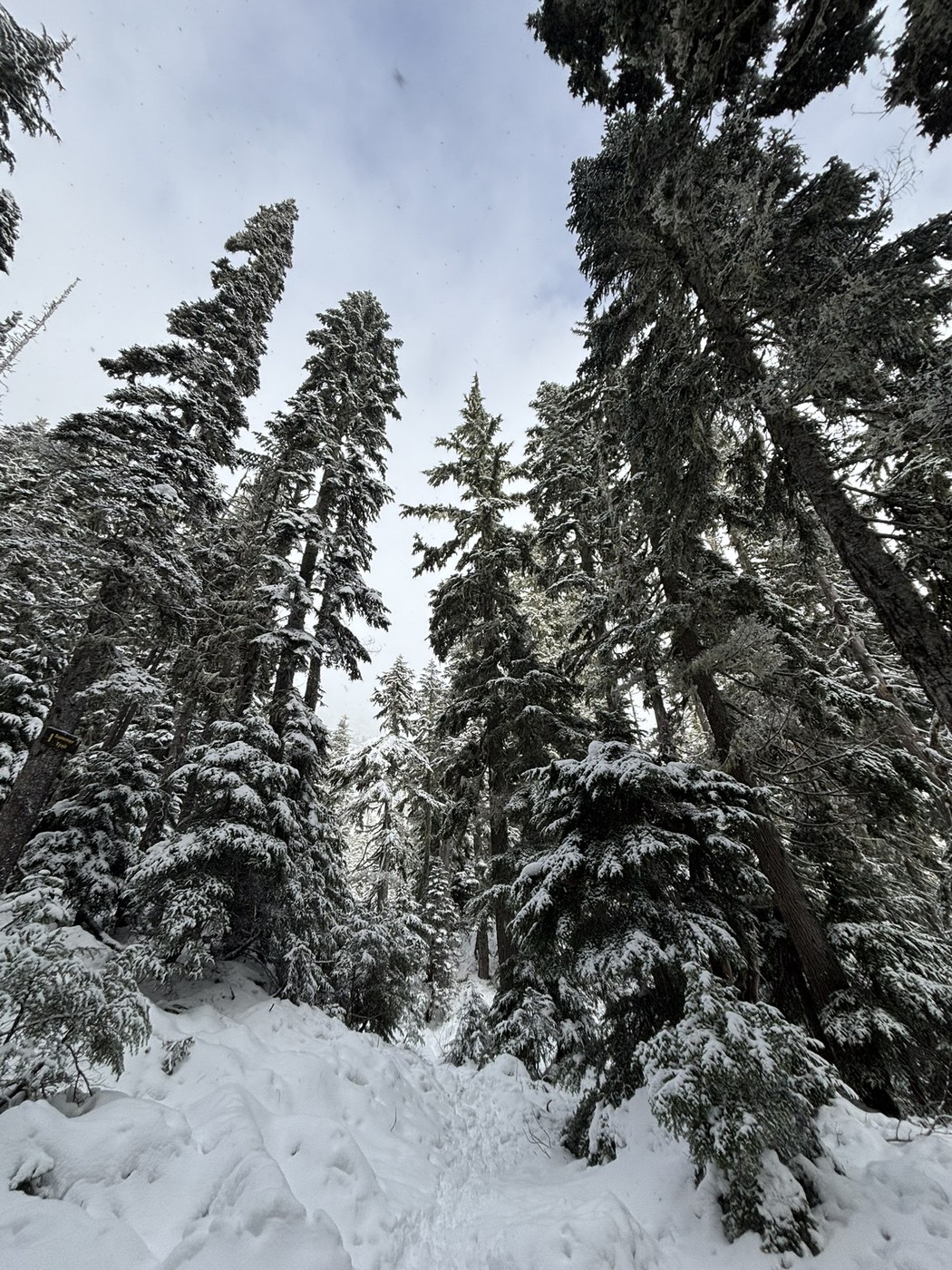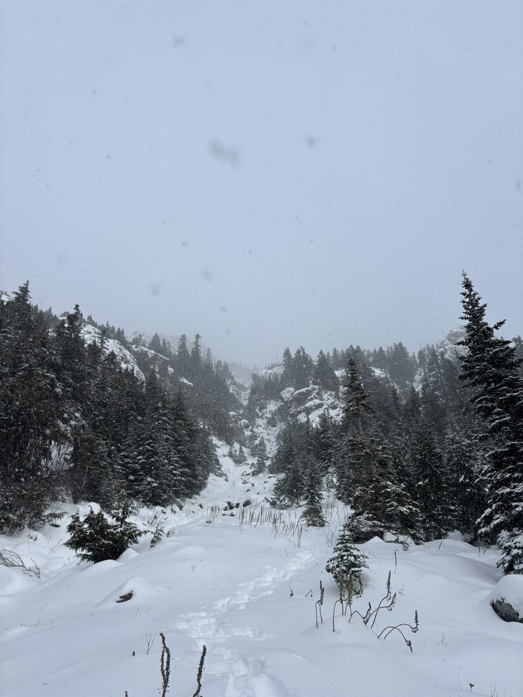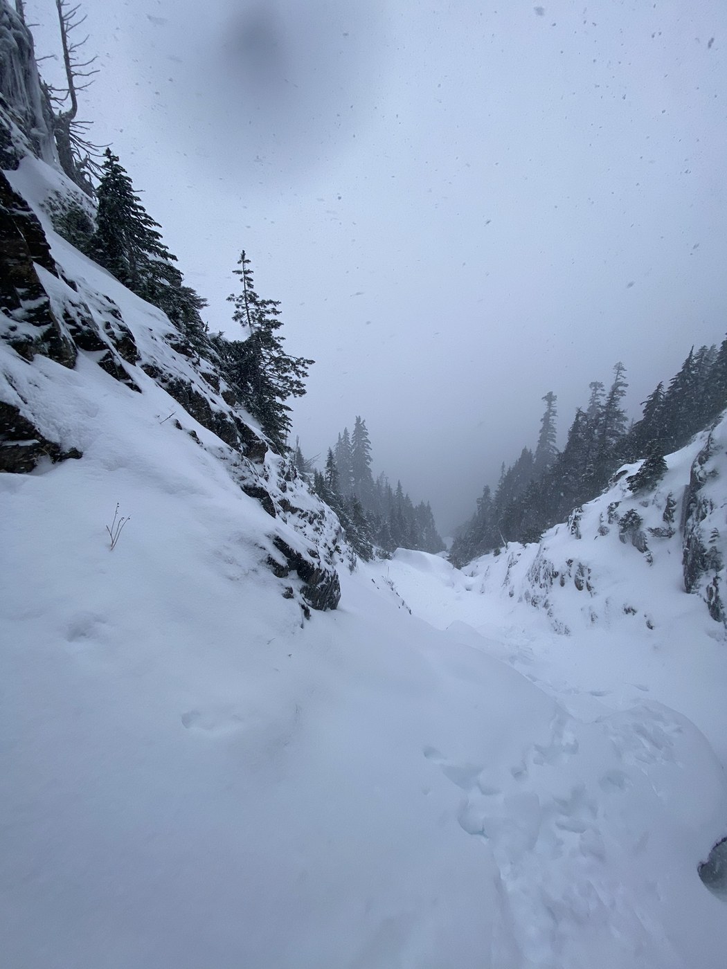 Made it to the lower trailhead and parked there. The road was fine until then, but we didn’t want to try going to the upper trailhead. There was snow starting at the lower trailhead on the hike in. Passed another group once we reached the junction with the upper trailhead. They said they made it about half way up the chute on the winter route and turned around due to deep snow and wind. Once we started on the winter route, we put on crampons before it started to get steep. The snow was definitely deep, I post-holed several times and the snow went up to my hips/lower waist. Once we were around 2/3 up the chute, we hit some tricky sections. The snow was very soft and powdery so it would slip right off the rocks and we were left with trusting the slightly icy rock. It also posed an avalanche risk which made us turn around. It was snowing on and off the whole hike, but really picked up on our way down. We were happy with our decision and had a great day out in the snow. Happy trails :)