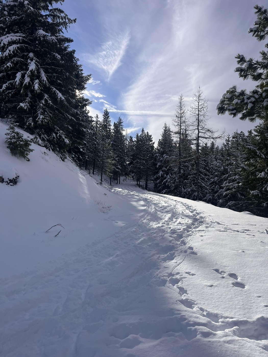 The first half mile was awkward over uneven terrain and low snow coverage. But once we turned off on the trail, which discourages motor vehicles, we found deep soft snow and minimal traffic. The trail is ungroomed but there is a path where others have gone before. At about a mile the views open up and it becomes a true winter wonderland. Perfect weather: partly sunny, no wind, low 30s. We turned around at 2.5 miles. And the trek back to the car went fast: 5 miles round trip, 500 feet gain, 2 hours.