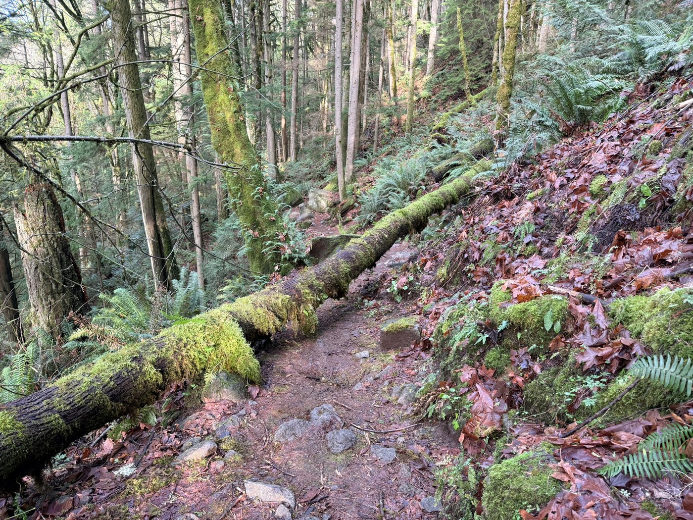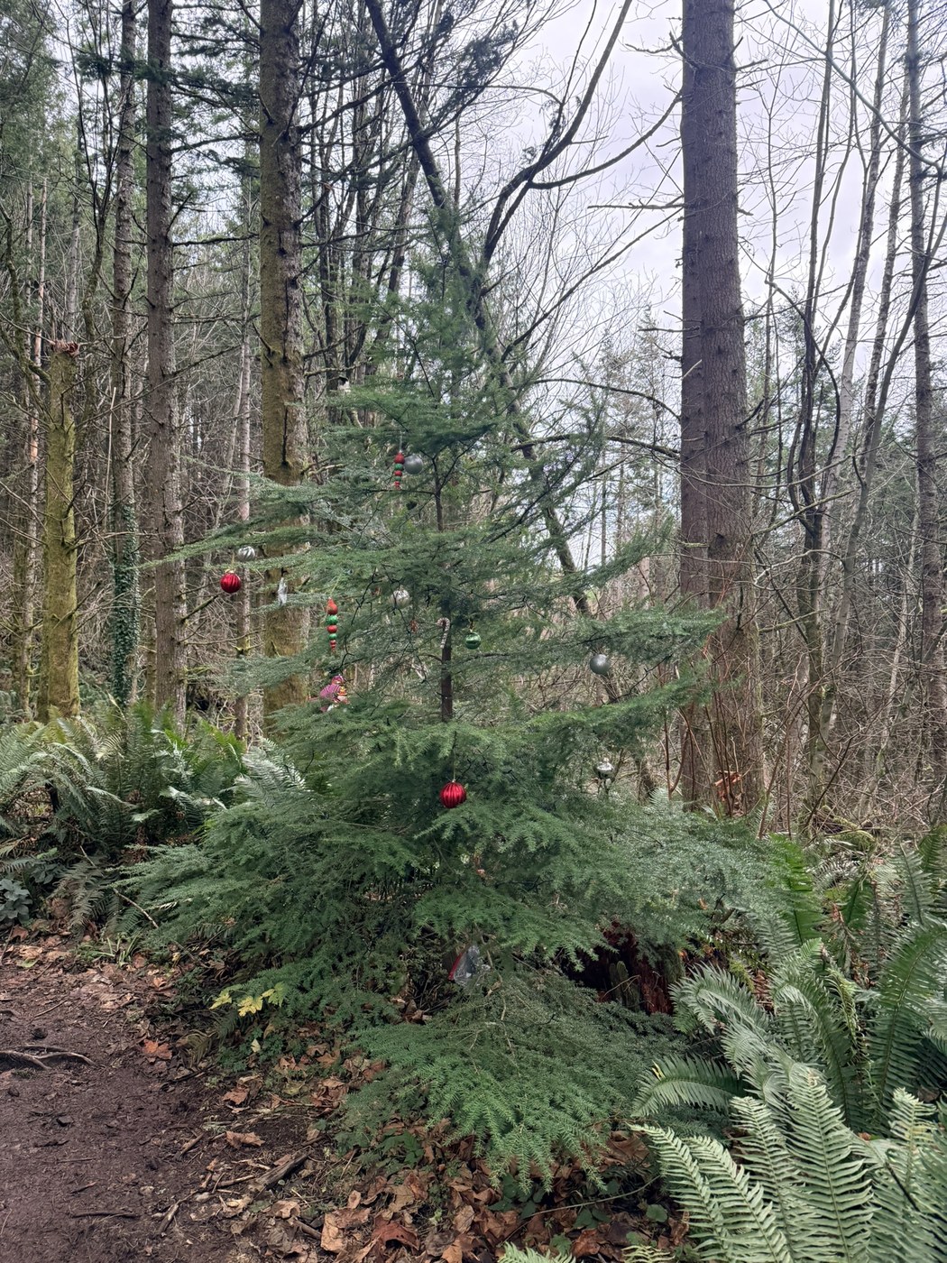 Some mud and slush in the field leading to the trailhead but otherwise the trail was in excellent condition during the few hours of clearing this Monday afternoon. One downed tree across the trail near the trailhead but easily crossed over. The Xmas tree on the trail was a merry sight.