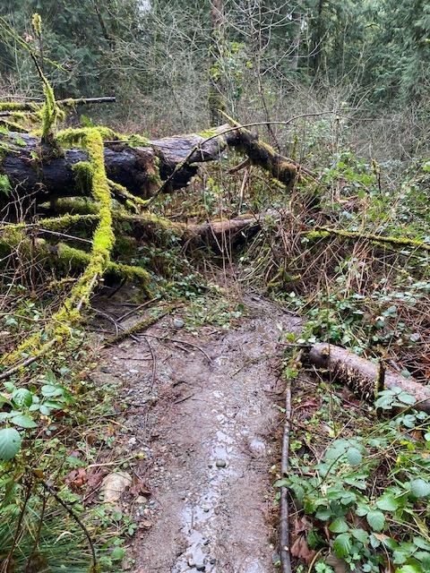 The trail is in generally good condition, despite the recent rainstorms. There were spots on the TMT with running or standing water, particularly in the lower section where a channel had been cut by storm runoff, but nothing major. There were a number of blowdowns, but only a couple caused even minor inconvenience (see photos).
