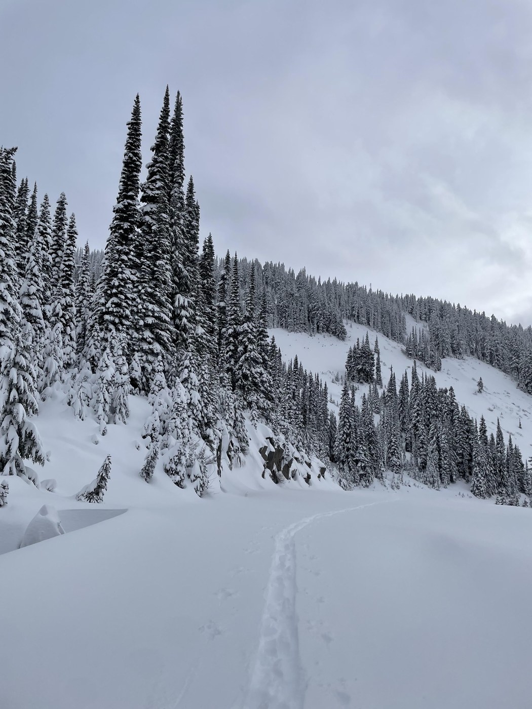 Since Nisqually Vista was a no-go and I wasn't interested in Skyline just yet, I hit Valley Rd, which is closed to vehicles, but open to ski and snowshoe travel. Super soft snow. At times, I sank a foot at least with my snowshoes. The trees are heavily loaded with snow. Winter wonderland all the way down to a nearly monochormatic colorscape. The poles are up on the road at 4th crossing where the rangers would like people to turn around due to avalanche chutes beyond that point. It looked like no one had been up Mazama Ridge yet.