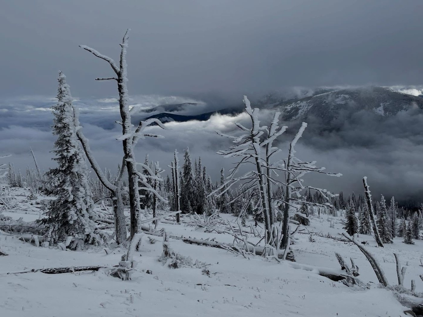 On Monday the day started with a beautiful sunrise, and it definitely proved true that it was an indicator of some incoming interesting weather. I started my day by hiking the Kettle Crest South with a loose goal of maybe making it to the Edds Mountain Trail, or maybe Barnaby Buttes, or maybe even White Mountain. But I didn't want to have to stop to cut any trees along the way, and as I approached the junction for Edds Mountain I found a spot where alder were sideways over the trail. I decided to just turn around an hike back to enjoy lunch inside the cabin and then continue hiking elsewhere, rather than try to get around the alder patch.