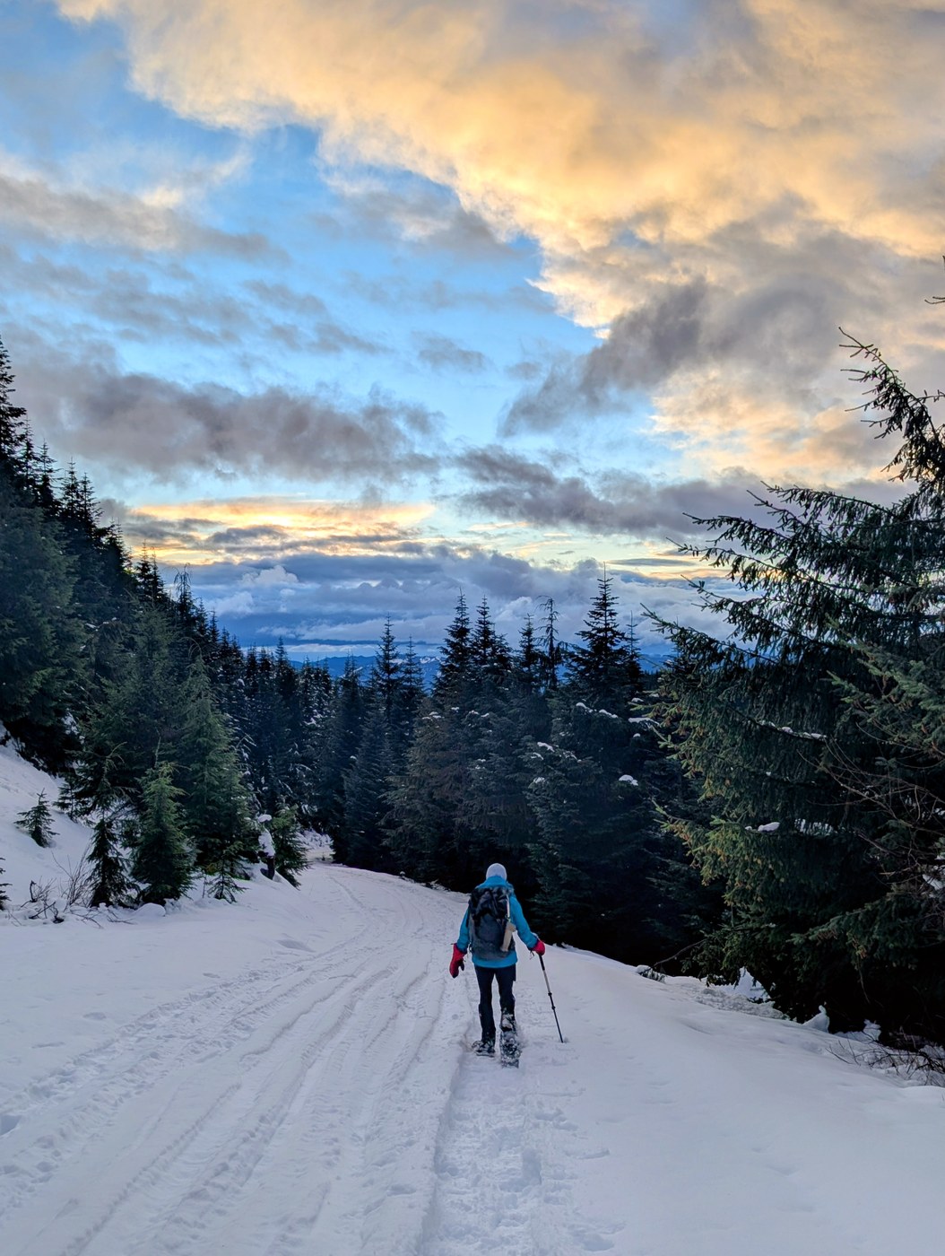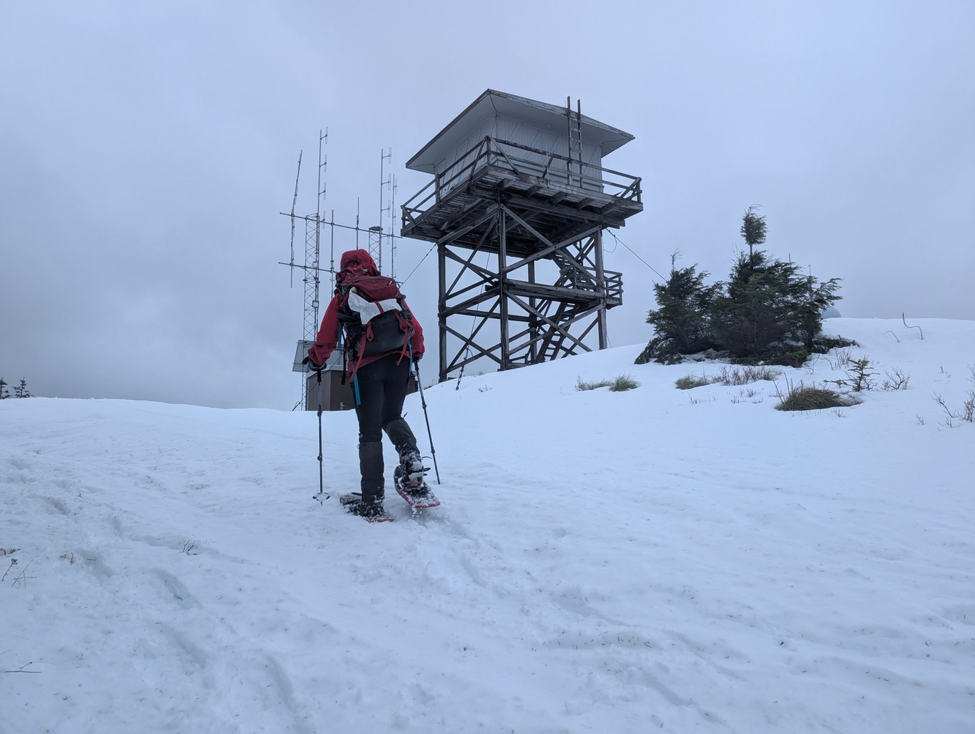 Christmas day, we left the hut at 8:30 for the 13-mi/2800ft round trip to Puyallup Ridge Lookout. It is all on FS roads, but some roads branch off, so a map will be helpful here. The road, now snow-covered, goes up originally, but then roller-coasters for the rest of the hike. We broke trail using snowshoes, though the new snowfall will probably wipe out our tracks. It was hard work! We could see the lookout from about 4mi away, but we were still a long way off. We reached the lookout in a snowstorm, had lunch, took turns climbing the first flight of stairs for photos (we'd read mixed reports of recent work parties and sketchy stairs and platforms), and started back at around 1pm. We were back at the hut by 4:30, but, man, it feels like that trail goes uphill both ways. (It gains about 1700 on the way there and 1100 on the return.) The lookout was super cool! On a clear day, you could probably see Mount Tahoma from several spots on the trail and from the lookout itself. We were fried, but we geared up for some interesting conversations with the folks who'd come up for the night.