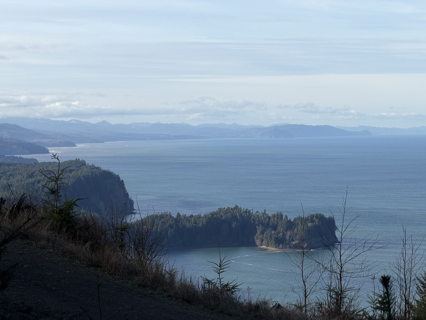 The trail was in great condition. We stopped for a snack at the top and used binoculars to admire the hardy folks who were surfing at Crescent Beach. It was nice to get some sun — although the wind was quite cold when we weren't protected from it.