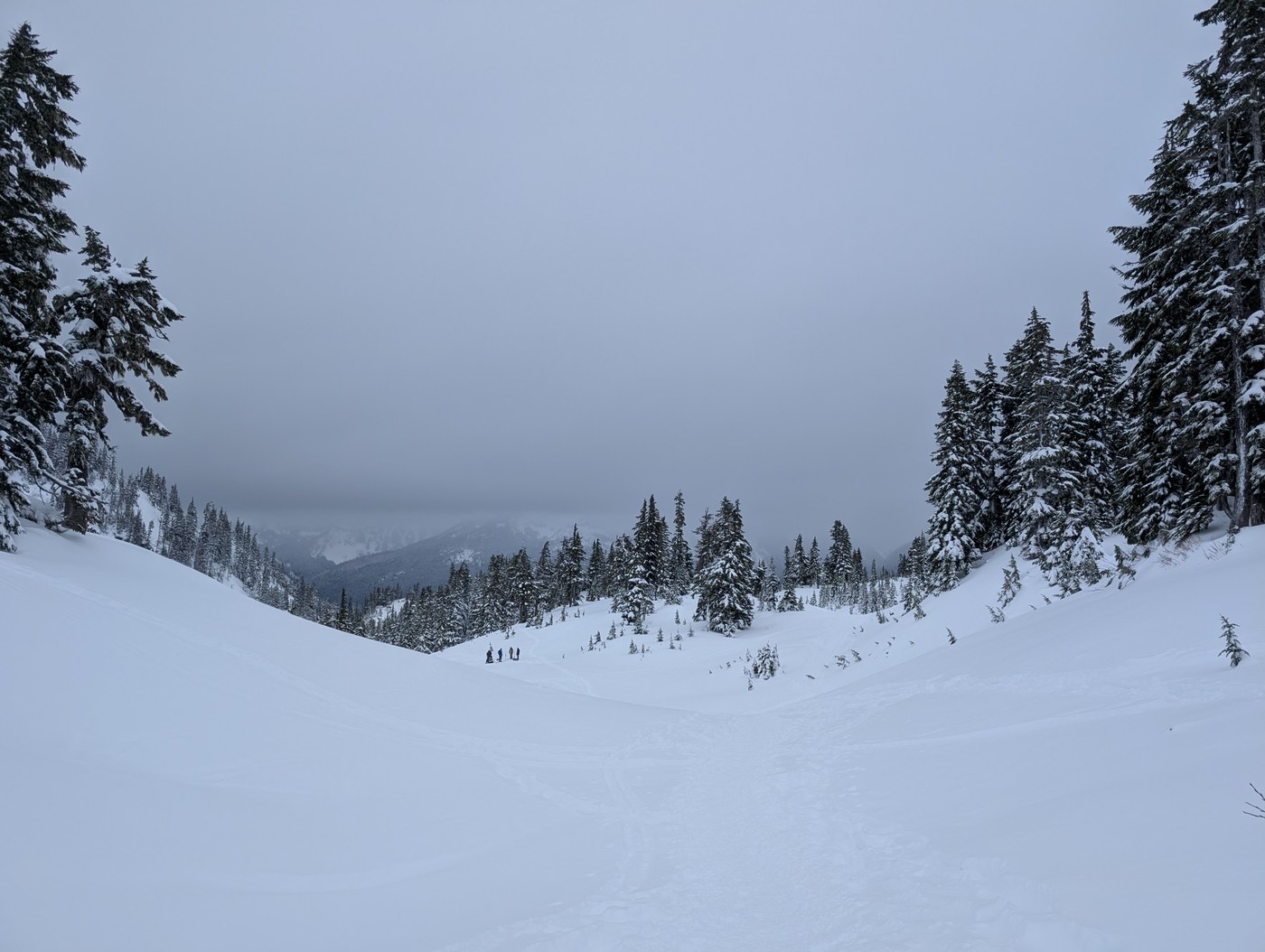 Great snow conditions today! Parking was at a premium, but I managed to squeeze my Subaru between a couple of other Outbacks near the lodge and walked up to the winter parking lot to start my snowshoe. Temperature remained around 28 degrees with a low cloud cover. The trail wasn't too busy, and the shoeing was easy on a good track. Always a fun hike while the kiddos are skiing.