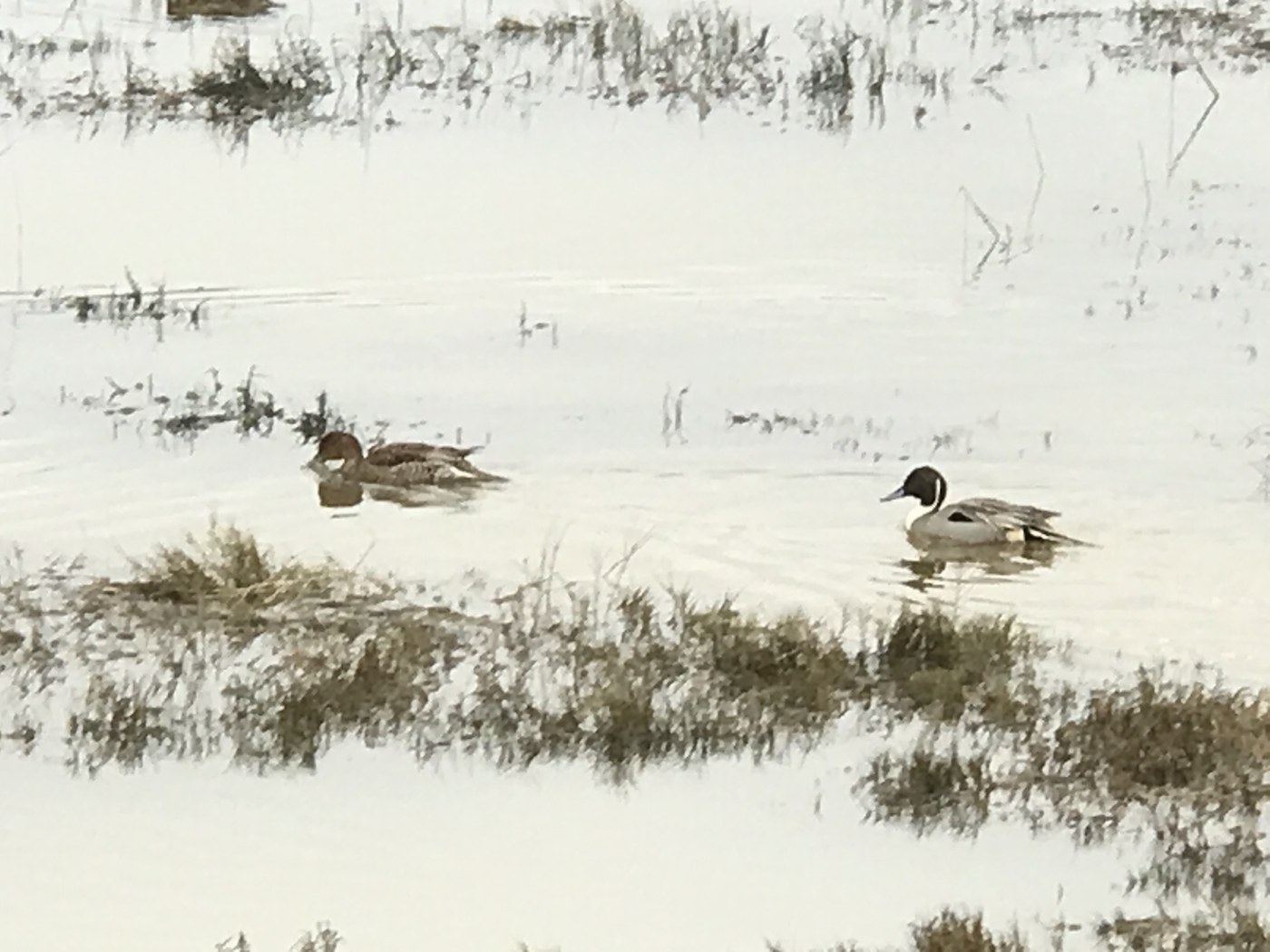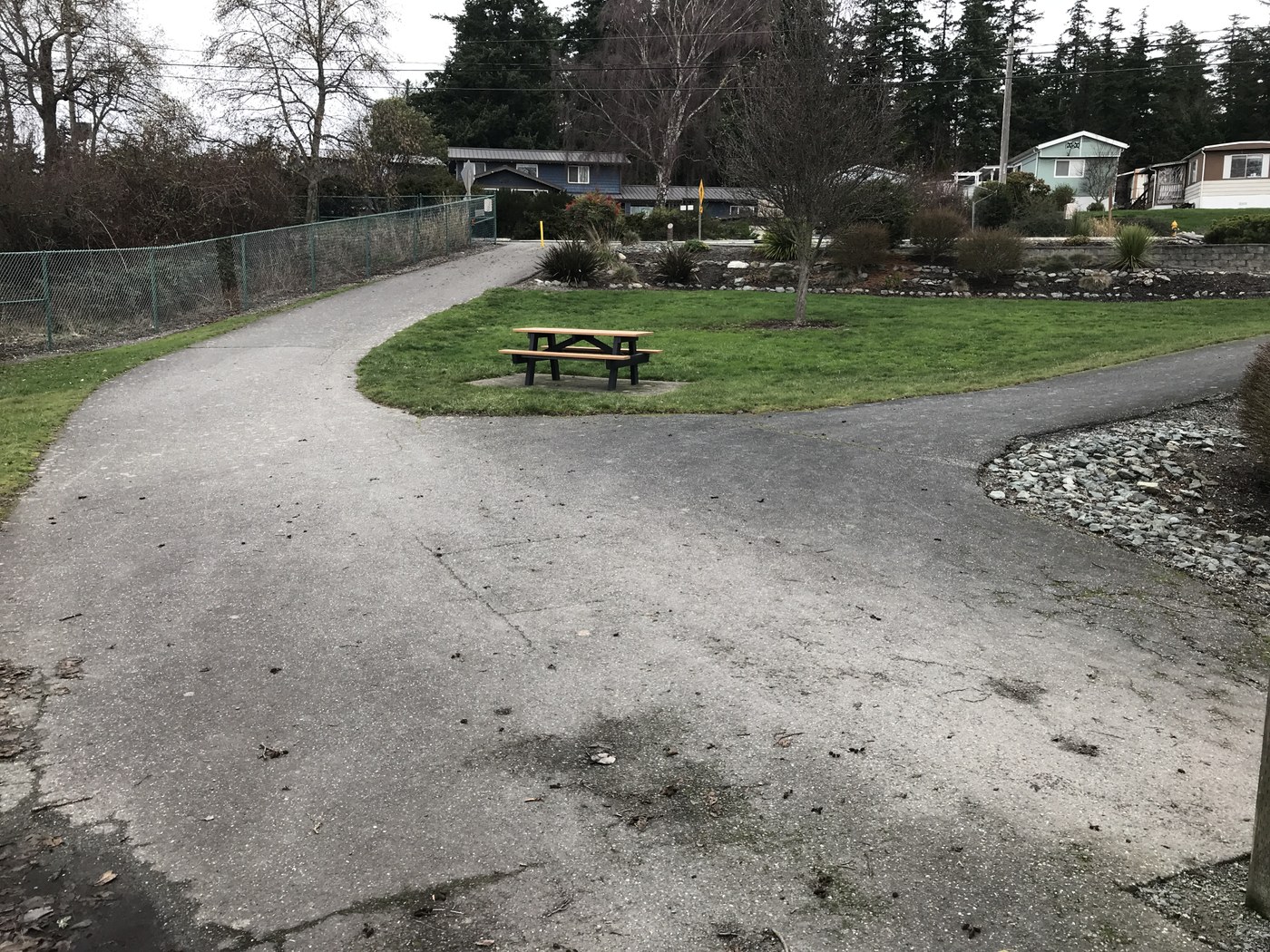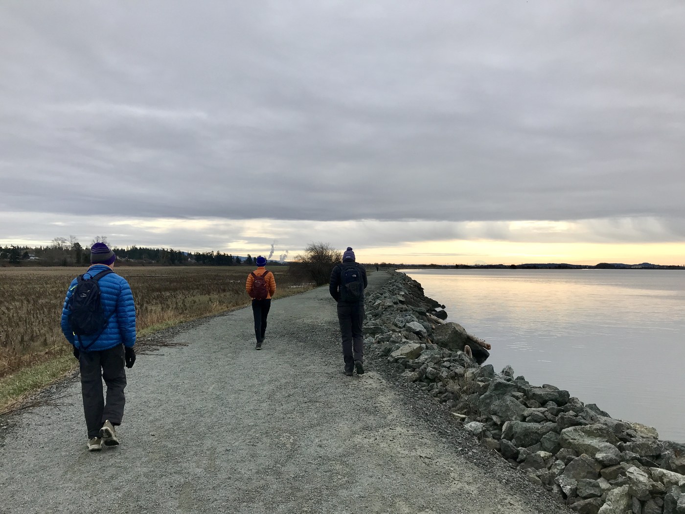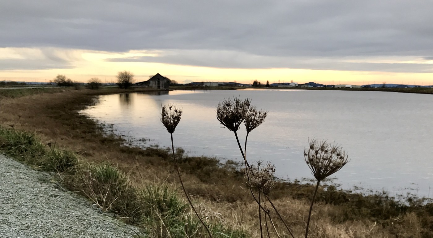 The walk is 2 miles and change each way. More trail side benches have been installed since I was last here. No use to us this time as with a stiff breeze and cold temps we were all about moving along. Plenty of bird life along the way (herons, ducks, eagles, perching birds), and the always amazing wide open views out to the San Juans. We could even see Mount Rainier off in the sunny distance even as the sun stayed stubbornly behind the low cloud deck over head. The distant sun shine also gave the horizon a sort of permanent sun set glow even though we hiked before noon! The seaward side water level was very high, with an impressive drop down to the fields on the land side of the dyke. At one point on the trail it seemed that waves must have even lapped the top.