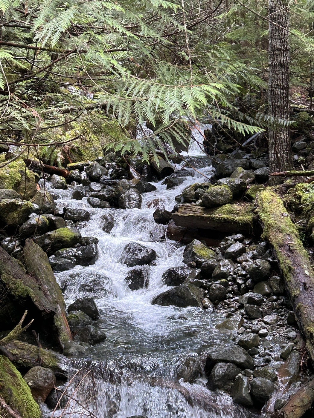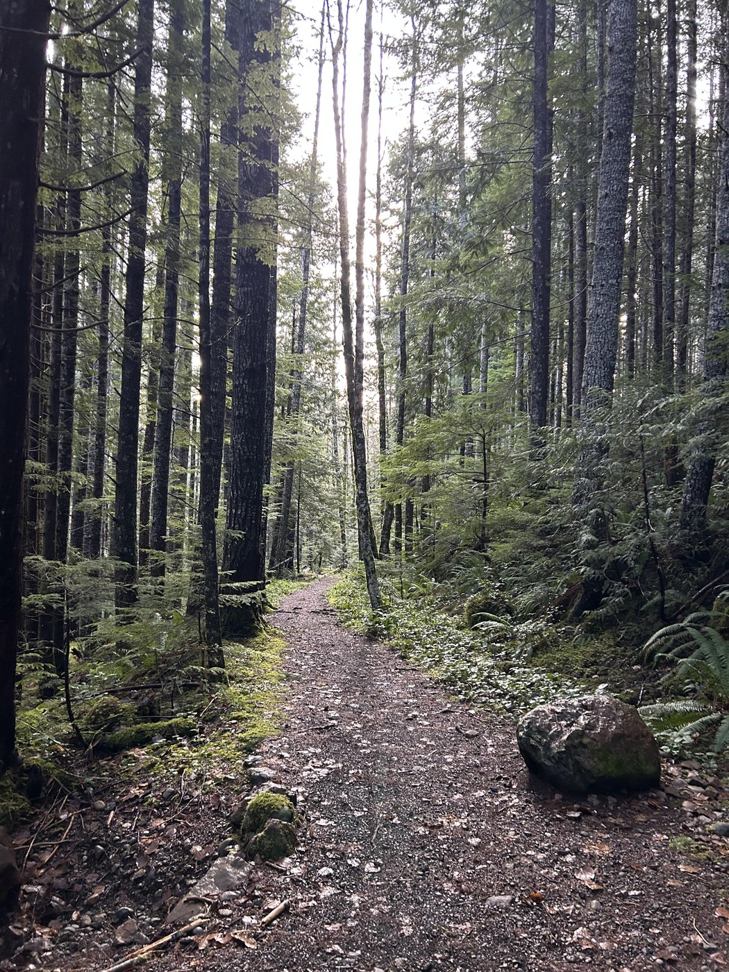 Brisk beautiful morning, arriving at the trailhead at 8:15. Campground is closed and the vault toilets are also closed. The creek is running strong and the trail in good condition— a few blowdowns that you can step over.
