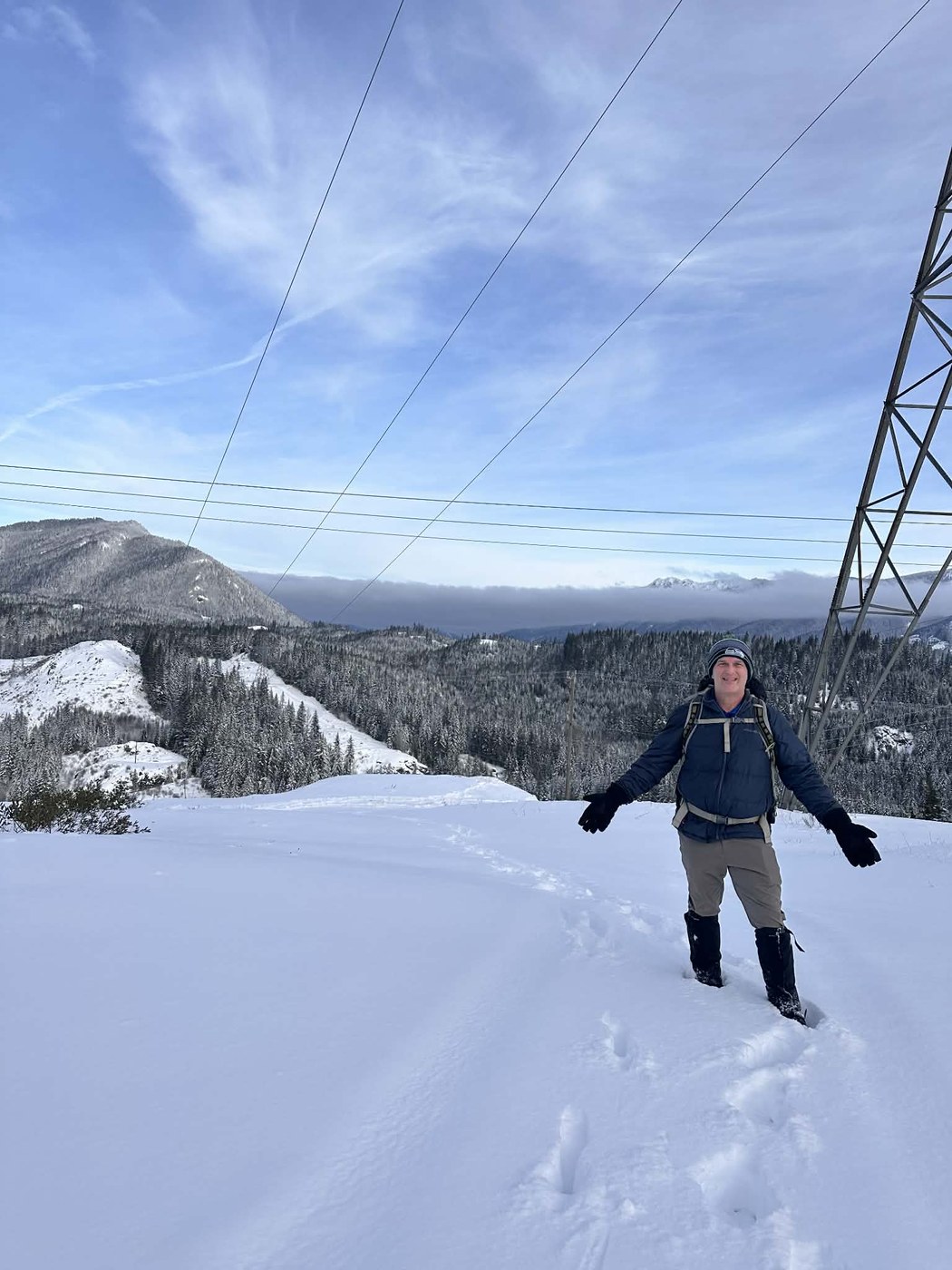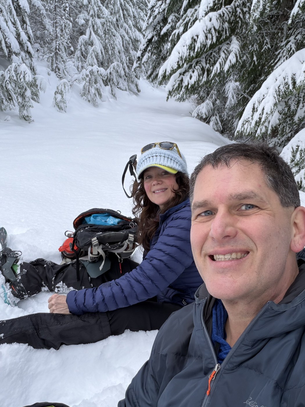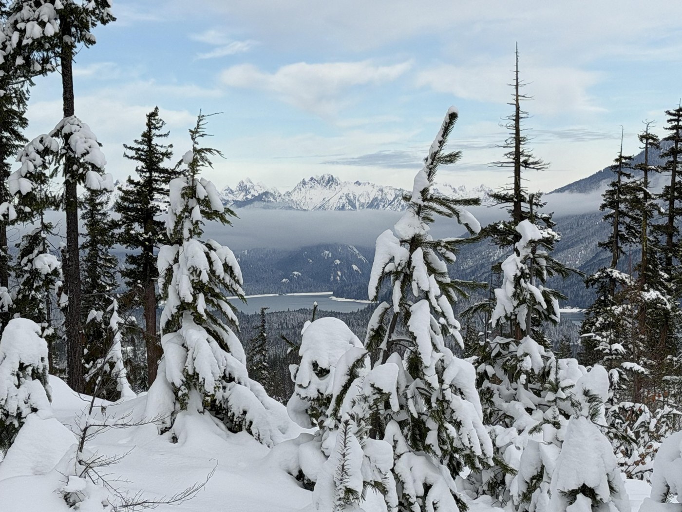 With the storm a few days ago there was a lot of heavy snow. We plunged even with snowshoes and it was quite the workout. Gaining nearly two thousand feet on snowshoes plunging into heavy wet snow is quite the workout. It was very pretty with the flocked trees and the views were stellar once above the power lines. If you want it go get it now. Our tracks should be easy to follow for the next two days. You’re welcome.