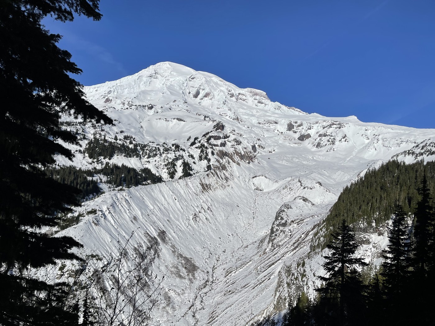 Note on the road and lots: Today there was compact snow and ice from just before Longmire all the way to Paradise. 2-wheel drive had to chain up (I think at Longmire). Taking it slow, my Subaru Crosstrek did fine. One slip-n-slide moment near Longmire. The lower elevations seemed icier. With all the melting today from the warm temps, I imagine it will be an icy drive in the morning. The lots were icy in the morning and slushy in the afternoon. It gets dark in the forest on the lower half of the drive by 3pm.