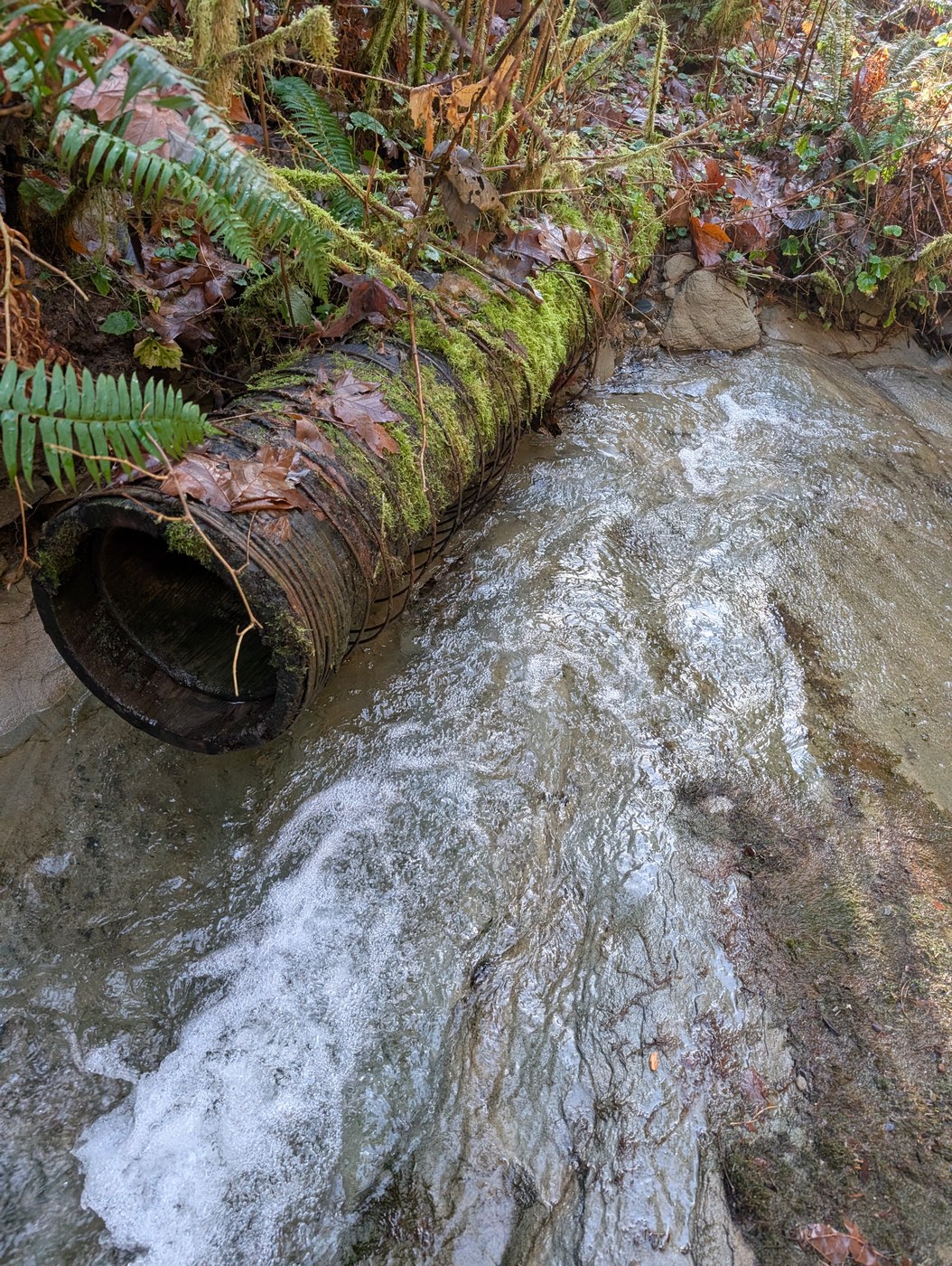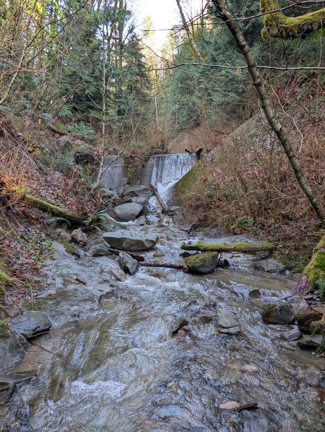 This was a fool's errand, and I was the perfect fool to give it a go. This is a bike trail that crosses Silver Creek then turns right steeply uphill while the creek goes left. To reach the falls stay with the creek. The 'trail' is a terrible bushwhack on the left and right side at the beginning and you'll have to cross the creek a few times, whichever offers the path of least resistance. The right side being a bushwhack and the left side offering half submerged rocks and some muddy bank the rest of the way. I mostly bushwhacked on the way up but stayed near the creek on the way back which worked much better. There were quite a few little side creeks as well. Waterproof boots and poles are a must. When I reached the old 1930's dam the only way around was up the steep hillside left but it was crumbly sandstone, mud, and debris that was too slick to ascend. I went far enough to peak over the dam and the waterfall looked like a trickle anyway.