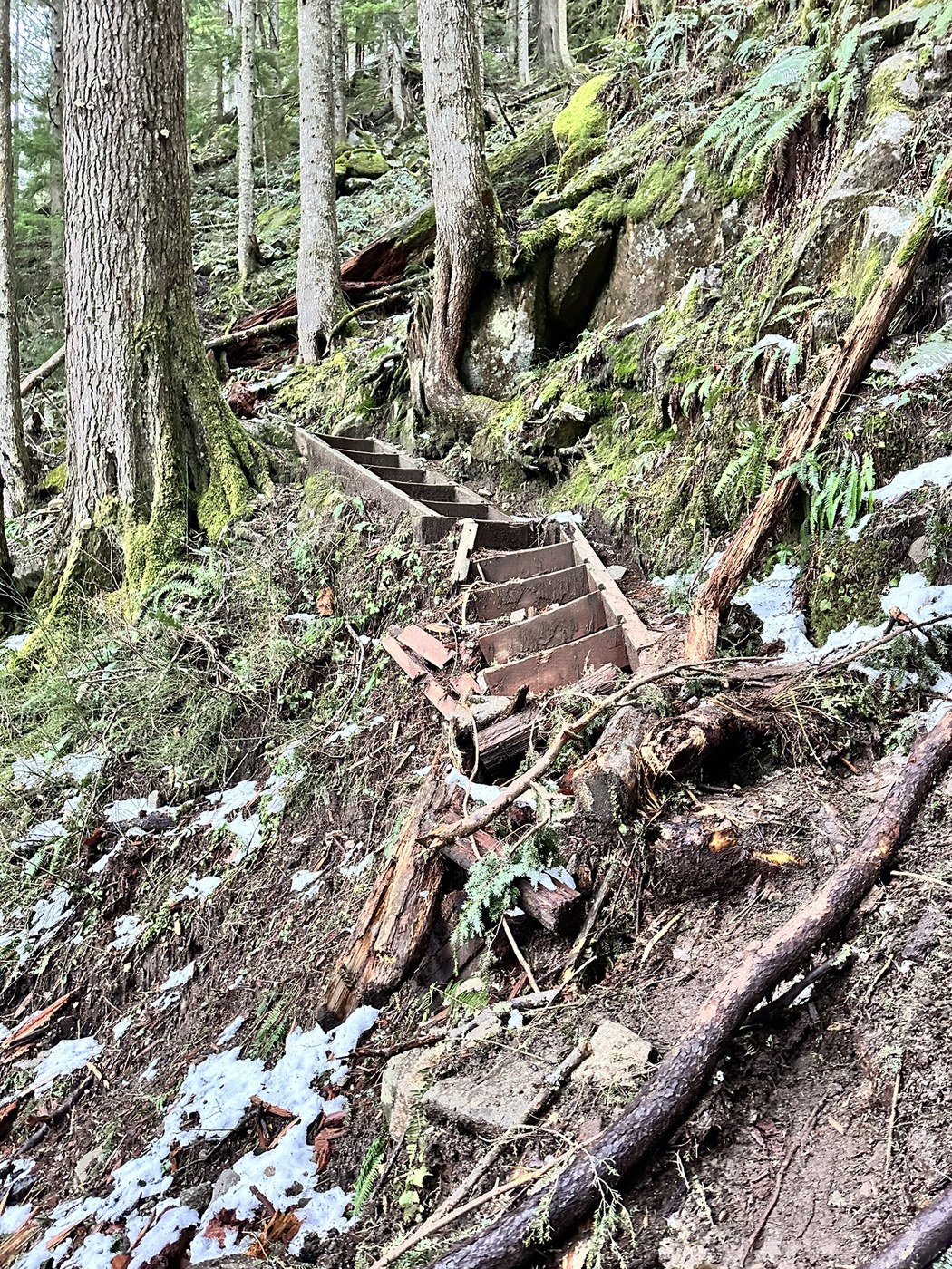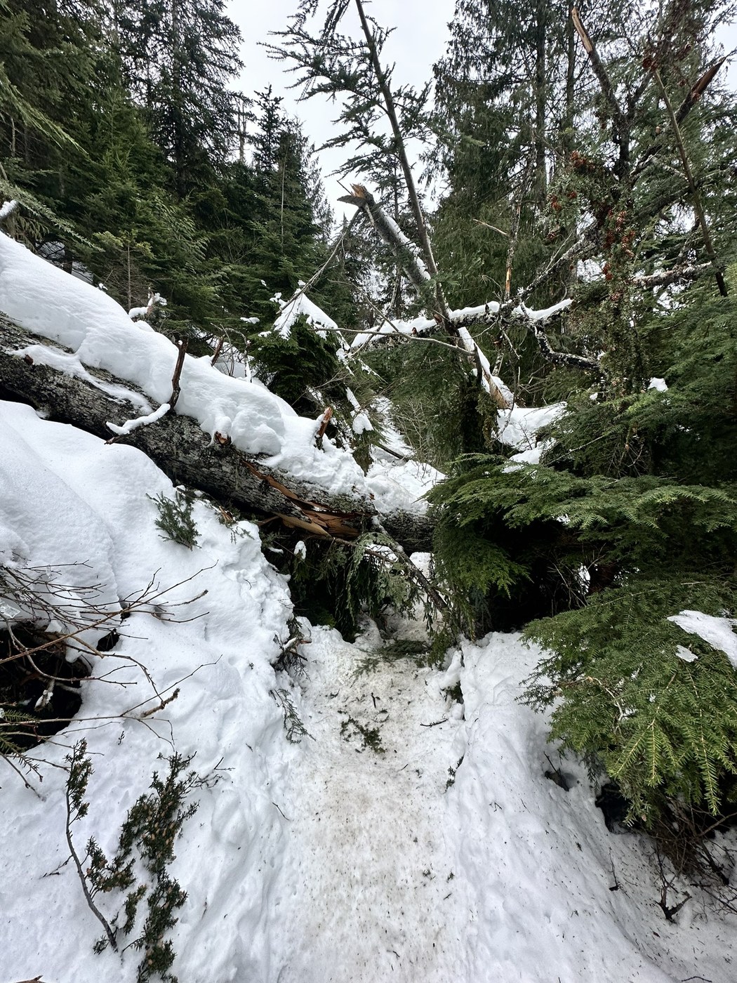 I tried going up without Crampons and quickly realized I was going to be very annoyed slipping and going slow so I threw them on. There’s ice and snow intermittently through the trail so I kept them on the entire time but it did suck sometimes when it was just rocks. About half way or a little more than half way in you start see some of the trail deteriorating because of the previous weather with steps washed out and branches and trees on the trail. The worst is about a quarter mile from the lake there’s a tree toppled over that you had to hop over but it’s not terrible. Lake was beautiful as usually and I took my time sitting on the big boulder for an hour or so until I started my decent around 11:30. Everything was slowly melting by then and the need for crampons lessened but I still kept the on because I was too lazy to take them off. By the end of the hike it was a lot more slushy and muddy but still very doable.