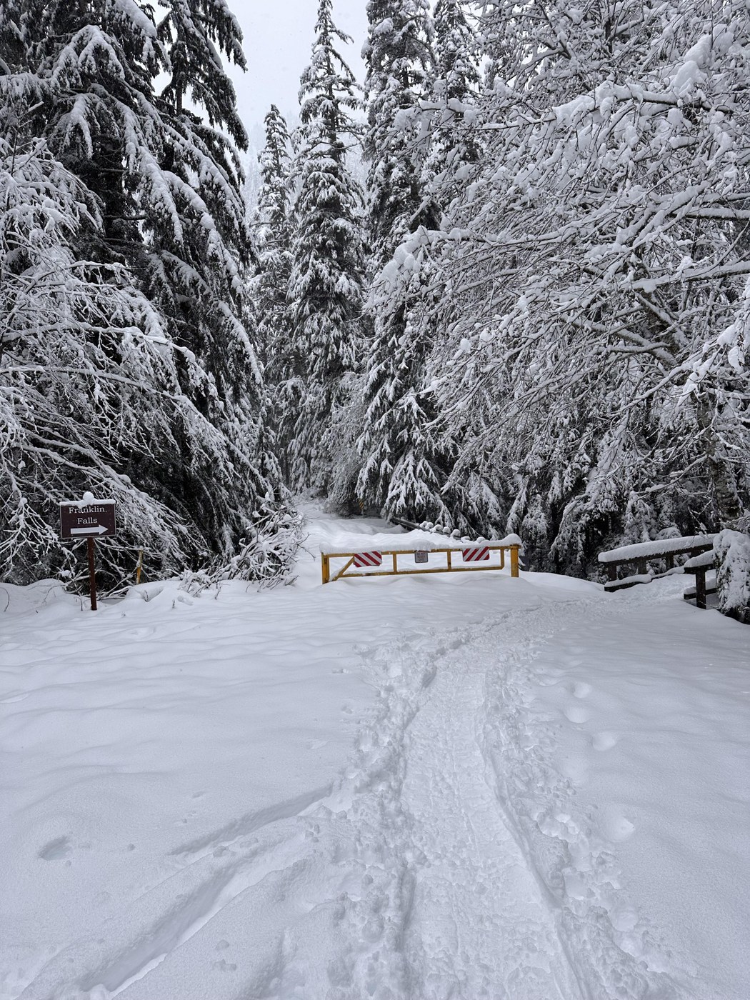 Beautiful day with fresh snow and light snow falling. Went from snow park at exit 47. 7 miles round trip since have to walk road. Road snowy entire way but a local drove down on way back so tire path to pavement. Did not need spikes or snowshoes as traction good and snow packed down.