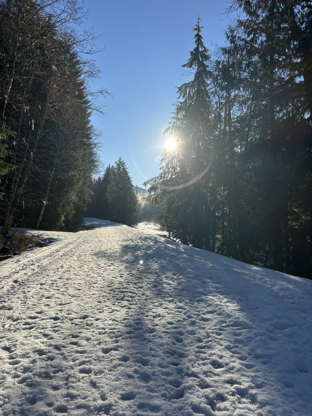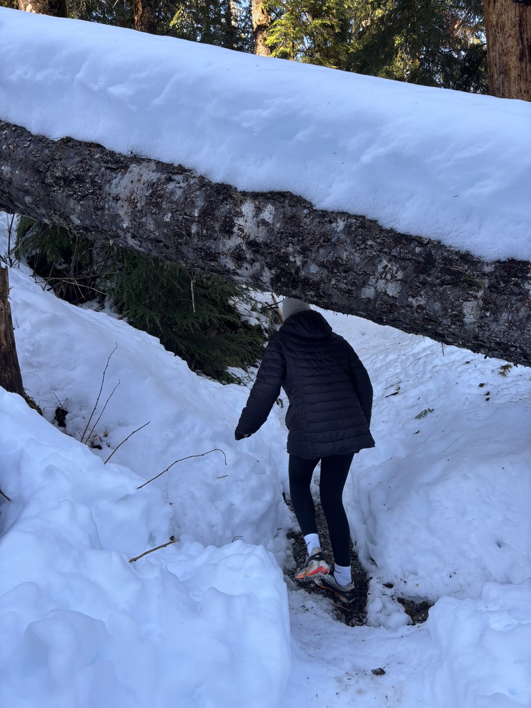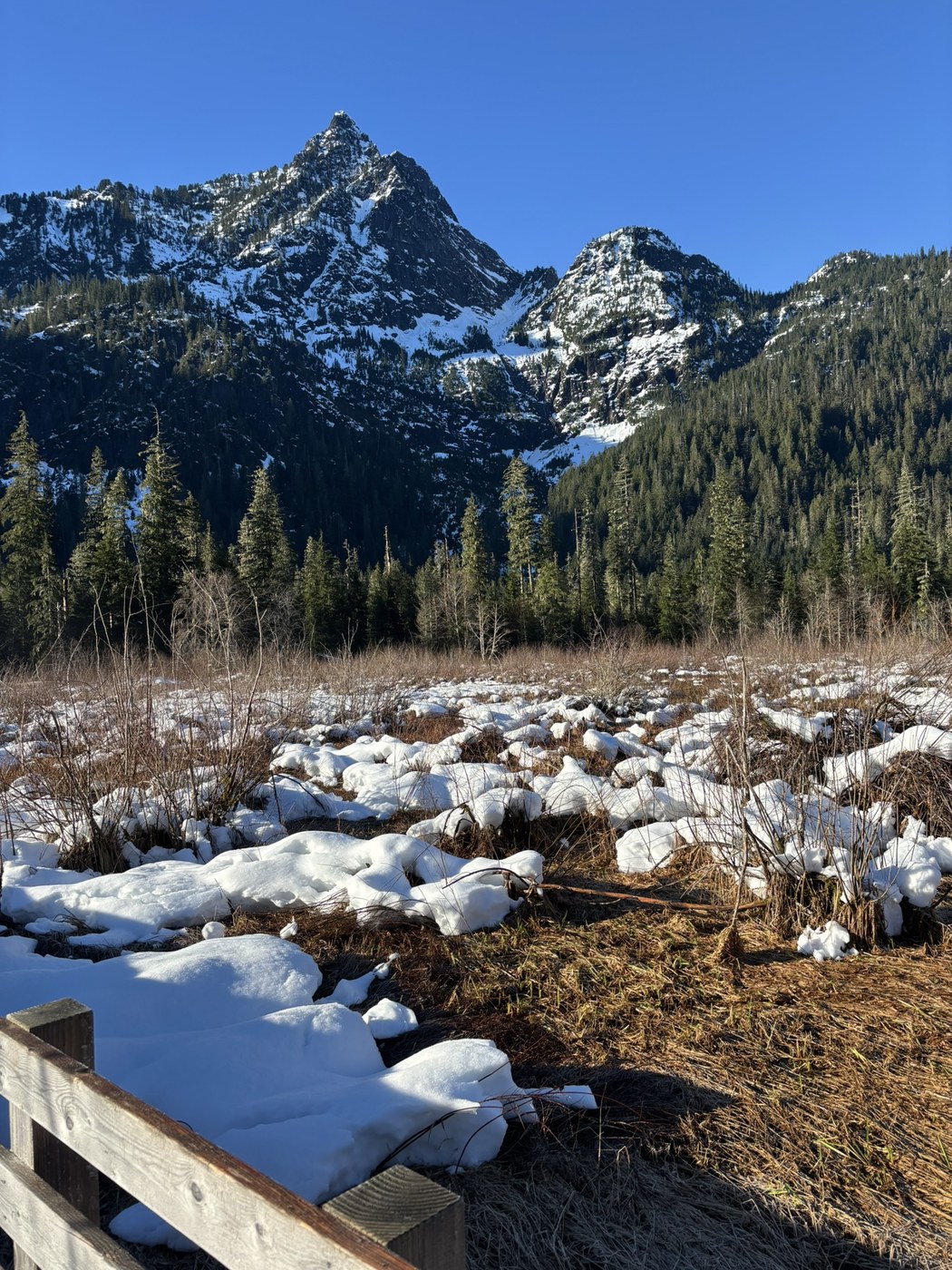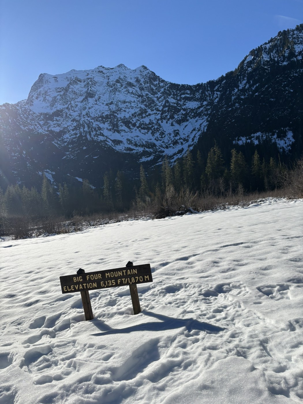 Today was an amazing day to be outside, I love a good closed mountain highway road walk and this was a great one! (Tomorrow I’ll hit Highway 20) The road from the closure to the Big Four trailhead is nice hard packed snow and so is most of the trail. We used spikes the whole time and they were very helpful but probably not necessary. The trail is well used, easy to follow, and so beautiful. There are multiple trees over the trail but they are easy to go over, under, or around. I’ve been to Big Four in every other season and this was my favorite time yet! There are no facilities at the trailhead and all the toilets along the road are locked but there are places to stop along the way. We only saw about 5 people all day. There were a couple other cars when we got to the Deer Creek gate and about 5 when we left but it was getting busier as we drove away.