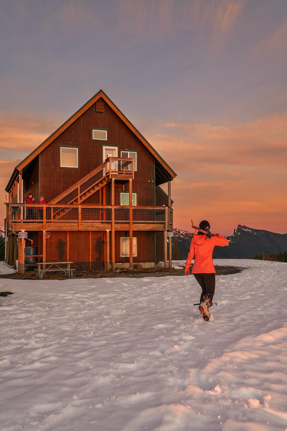 I decided to check out Bruni’s Hut for the first time, and my friend and I were lucky to grab a reservation just a few days in advance. We planned to use touring skis for the hike up instead of snowshoes, which most people use. Since I could not find any recent updates on road conditions, I originally planned to park at the lower lot. However, when we drove up, there was absolutely no snow, so we kept going and ended up parking higher. At that point, we were genuinely worried we would not be able to use our skis since we did not bring hiking boots. Thankfully, once we reached the higher parking lot, we started to see snow beyond the gate. We put our skins on and began the journey up. The snow was firm for the first two miles, then patches of dirt started appearing. We were able to maneuver around them on the way up without taking our skis off, but that was not the case on the descent. We shared the hut with seven other people, all kind and friendly older ladies and gentlemen. The weather was beautiful, and we were treated to a gorgeous sunset. Bruni’s Hut itself is very well maintained and thoughtfully equipped with nearly everything you could need for an overnight stay. The bathroom is outside and was probably the cleanest wilderness bathroom I have ever seen. The stargazing was incredible, and we woke up to stunning sunrise colors. The next morning, we skied down. The snow was icy, and there were at least three stretches of dirt/rock where we had to take off our skis and hike down. The descent would have been so much fun with fresh powder, but it was still a memorable experience. Definitely would wait to return until we have a decent snow fall again. Grateful for places like this in our beautiful state.