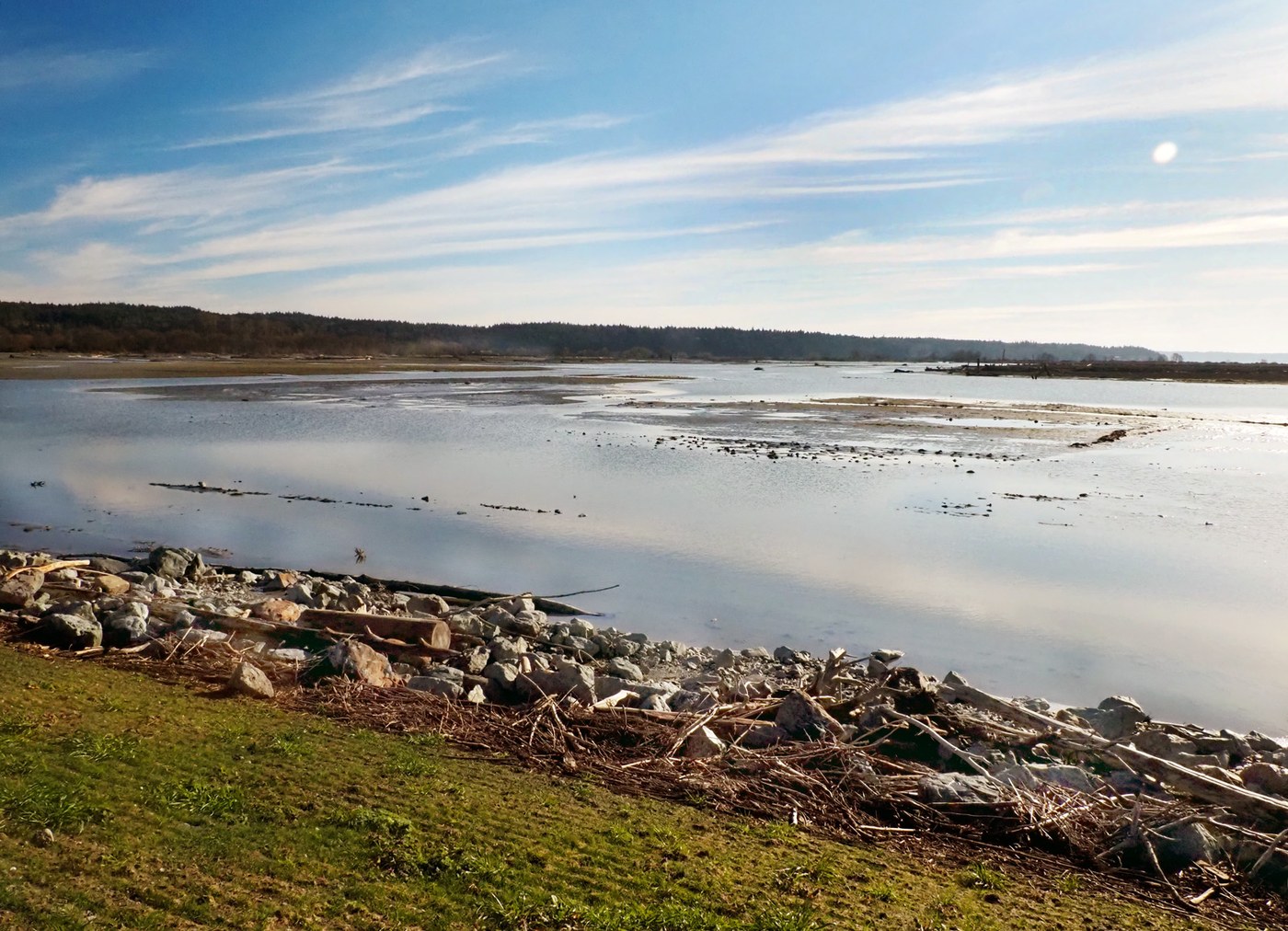 I went out to check out the Port Susan Bay Preserve for birds. It is often a good place to see large flocks of snow geese and raptors. This is the area south of Stanwood that is a part of the Skagit Wildlife Areas at the end of Boe Road. Going down the road I began to wonder if I was on the right route. The land to the left (south) side rose up about fifteen feet to form a dike. The road ends abruptly at a small parking area after passing a flood control structure. I climbed the dike on a new graveled access where I could see that what had been fields to the south are now flooded. The field to the north toward Stanwood is partly under water with excavating going on.