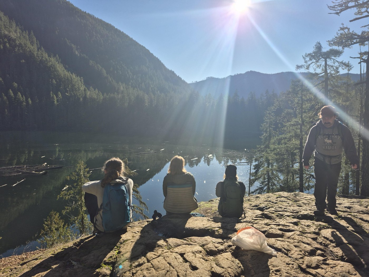 On this beautifully warm, clear and sunny day we lunched at Lena Lake near the water by a drowned fire grate, explored the ~8 campsites at the far end. The crossing @ Lena Creek (north side of lake) is flowing heavy, would be a bit tough to cross but doable if you're motivated. Basked at the high Lunch Rock overlooking the calm waters for about 10 minutes before descending at around 11:30 AM. MANY more people, dogs and families on the ascent - this sun had everyone smiling, the mood was infectious! Full parking lot back in the chilled and foggy valley bottom.