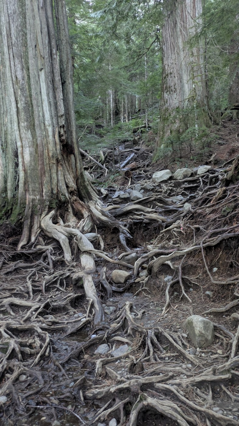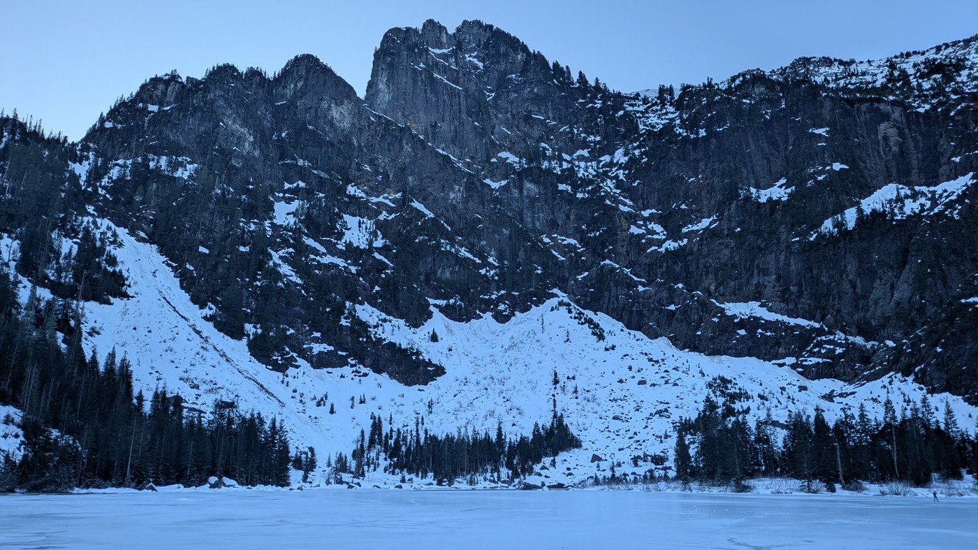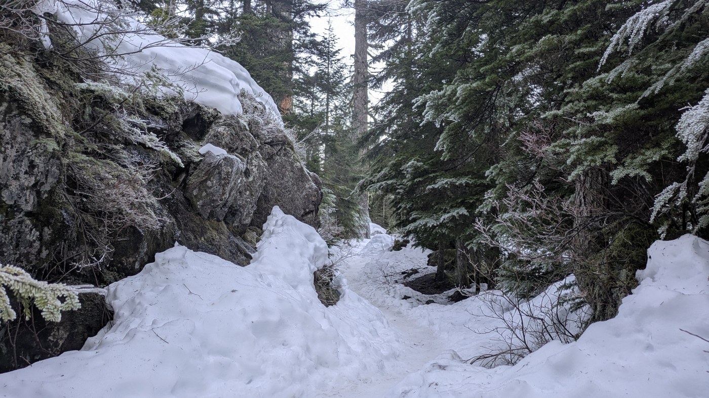 The road only has a few potholes of note, mostly clustered near the parking area. The main parking area still had a few spots at 8:15am on a clear, warm holiday Monday, and overflow seemed to still have openings at 10:30am. There are some fingerprints from the December storms left on this trail, but it remains in good condion, and the first 2/3mi are practically pristine. The snow in the last quarter mile was easily navigable even without spikes or poles, but always better to be prepared. There were a couple downhill sections that required some delicacy, but the most dubious footing I encountered was on frozen roots rather than snow. It was striking how much this felt like March or even April between the state of the snowpack and temperature. Go hug a glacier while you can.