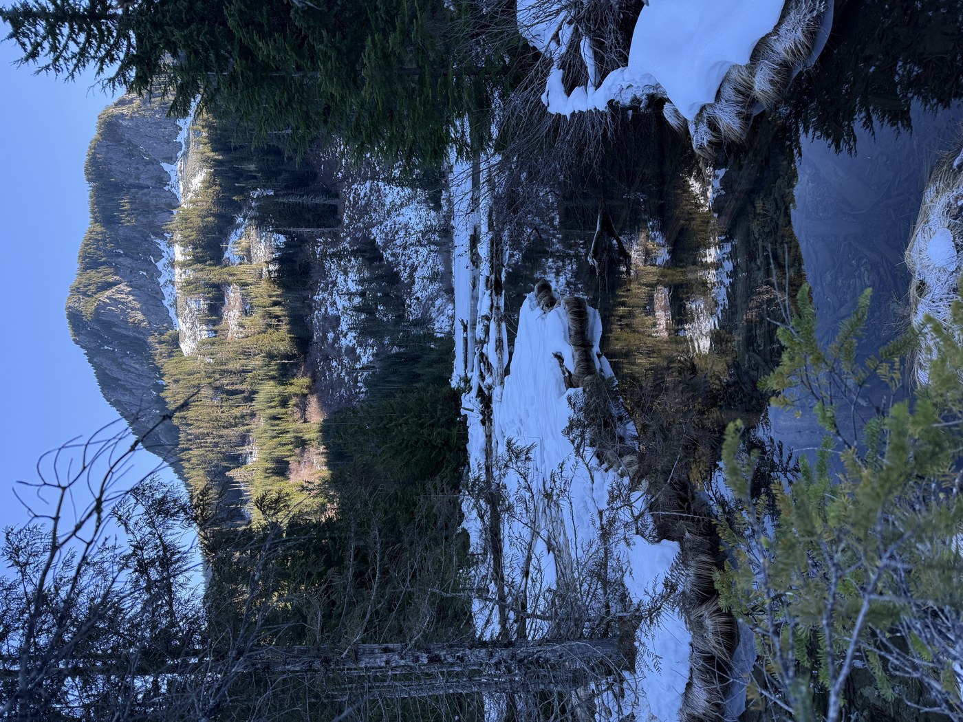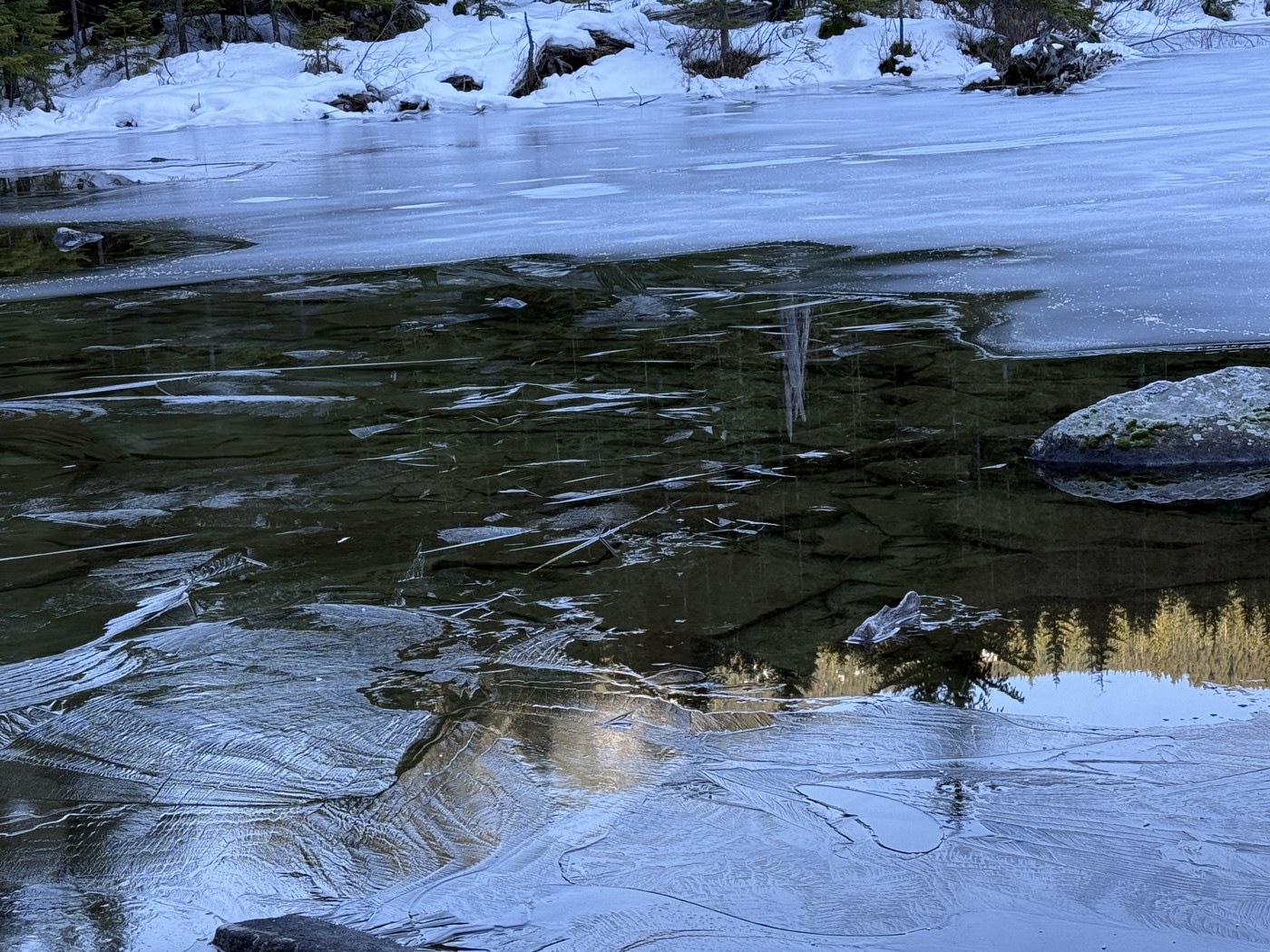 Great day for a hike. Sunny and mild. Trail has snow only at the very end. A little icy by the lake, but no traction was needed.