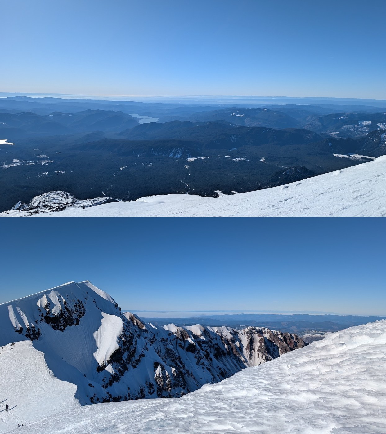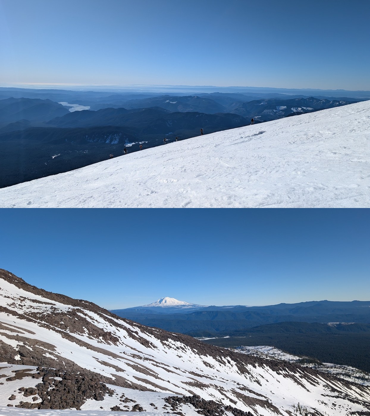 Disclaimer: I got a later start than I wanted due to very little sleep, was slower than anticipated going up, and I didn’t realize the “true summit” where you get views of Rainier and Spirt Lake was a bit more distance from where I had settled down when first getting to top of the crater rim. Despite being a pretty easy traverse with mild up/down climbers left along the rim to true summit, I was pretty gassed already by then and wanted to get down before dark, so didn’t get to tag the true summit. I had seen enough pretty stuff already, so was fine with it and will get it another day. Also since it’s winter, conditions can change a lot more rapidly, so keep that in mind with conditions described here.