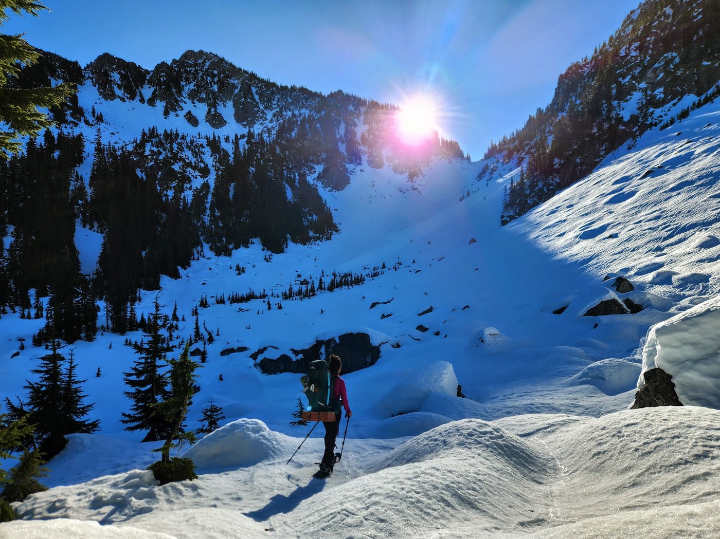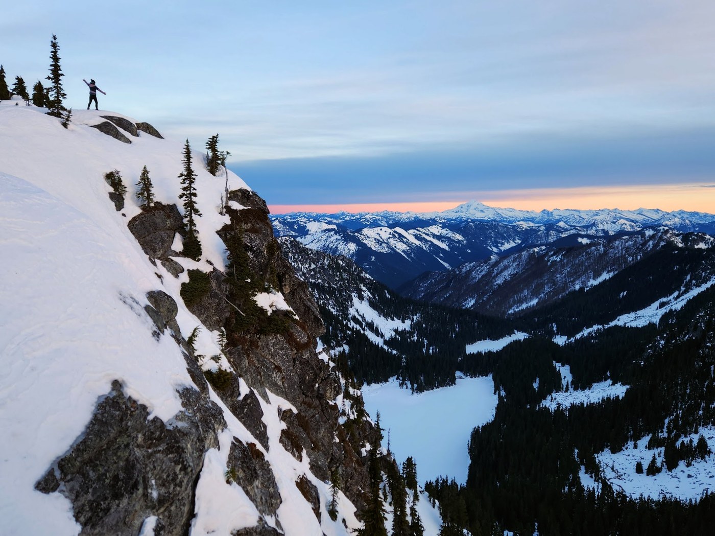 From Surprise Gap, a little bit of initially steep snowshoeing got us up and on our way to wrap around to the gentle southern flanks of Surprise Mountain. We made our way to the summit, where we set up camp with a view.