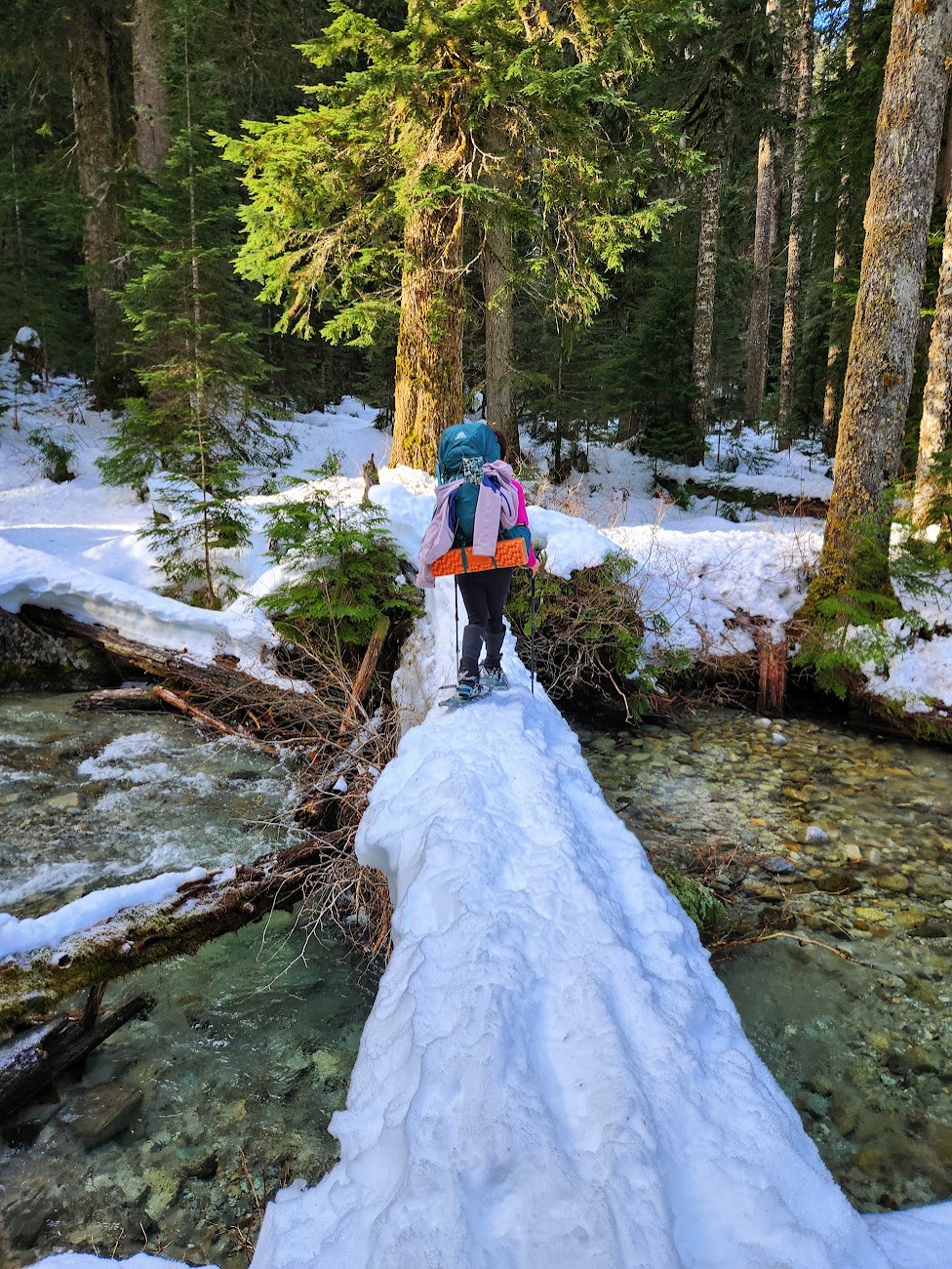The log crossing of Surprise Creek (about 1.5 miles in from the parking area) was snow-covered, but the snow was supportive enough that we were able to cross.