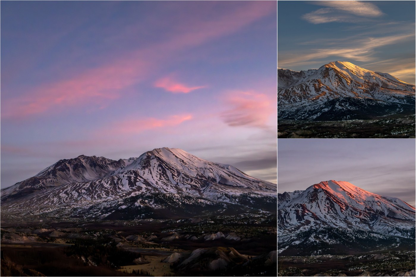 - Takeaway: I would say this felt more like a fall hike than a spring hike - spring would have more leftover snow from winter, with big drifts on parts of the trail! It was worth waiting for sunset on the ridge just before descending into the valley dotted with "hummocks" - the mounds in the foreground created by pyroclastic material blown from the mountain. We only hiked ~1 mile in true darkness back to the trailhead (virtually a new moon).