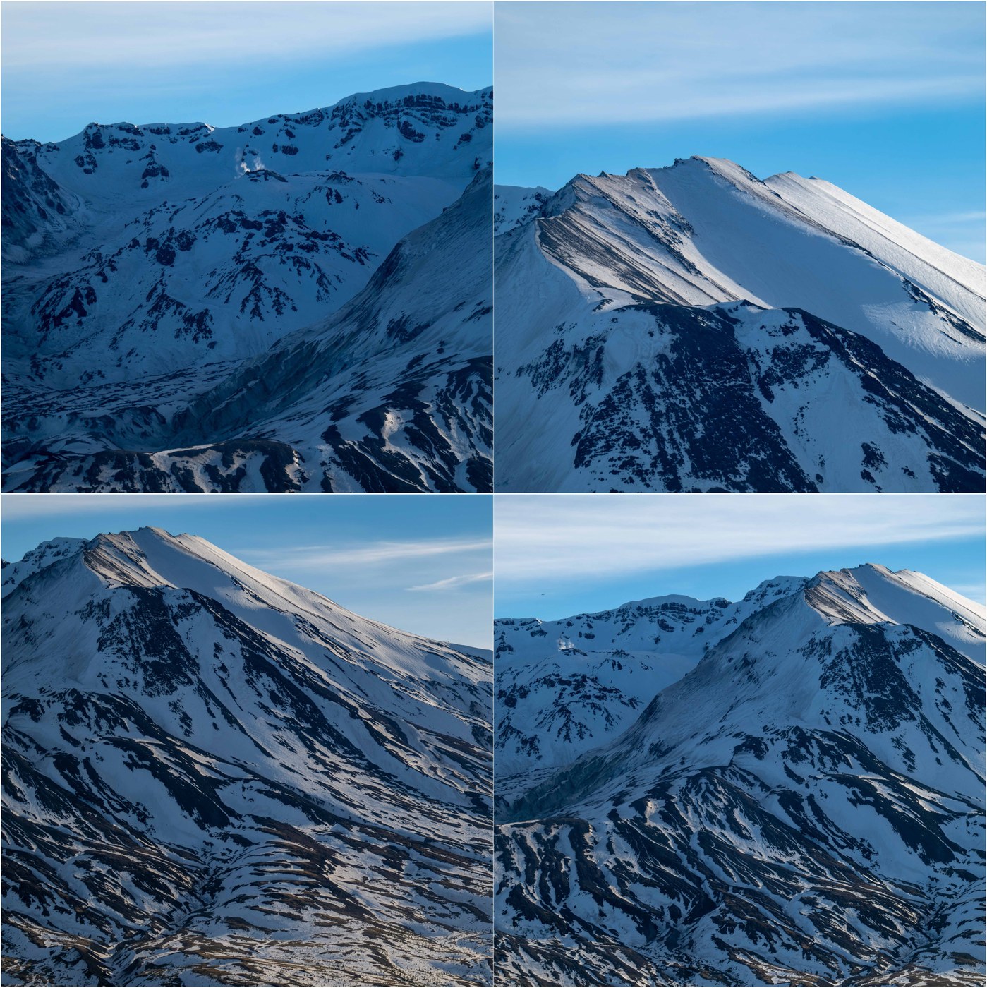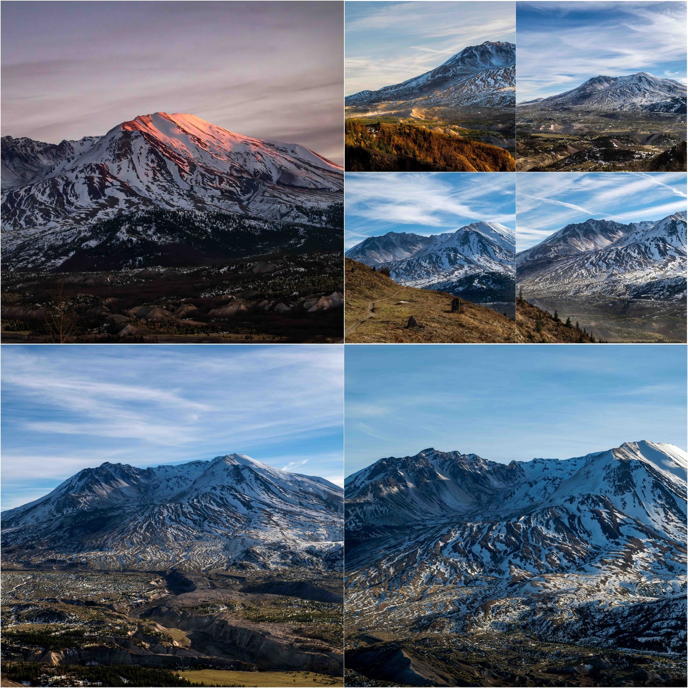 Beautiful hike through sunset on the Boundary Trail from Hummocks Trailhead (currently the end of the Hwy 504 due to a washout-induced road closure) up to the Johnston Ridge Observatory. With high pressure and a temperature inversion, easterly outflow winds were very strong and made hiking a little miserable for brief stretches due to clouds of blowing pumice and dust (visible in some of the pics below). We did not see any other hikers beyond the initial rise above the hummocks. The real story was the snow, or lack thereof. Mt St Helens should look like a "snow cone" not "chocolate marble"! There was more snow late last October. The trail is 95% snow free, and the mountain has exposed glacial ice in the crater. Pretty grim snow situation! But it WAS very beautiful. It is possible to hike beyond Johnston Ridge (e.g. Boundary out towards Harry's Trail) with snow, but pretty straightforward conditions for mid-January. Hopefully this snow season will turn around.