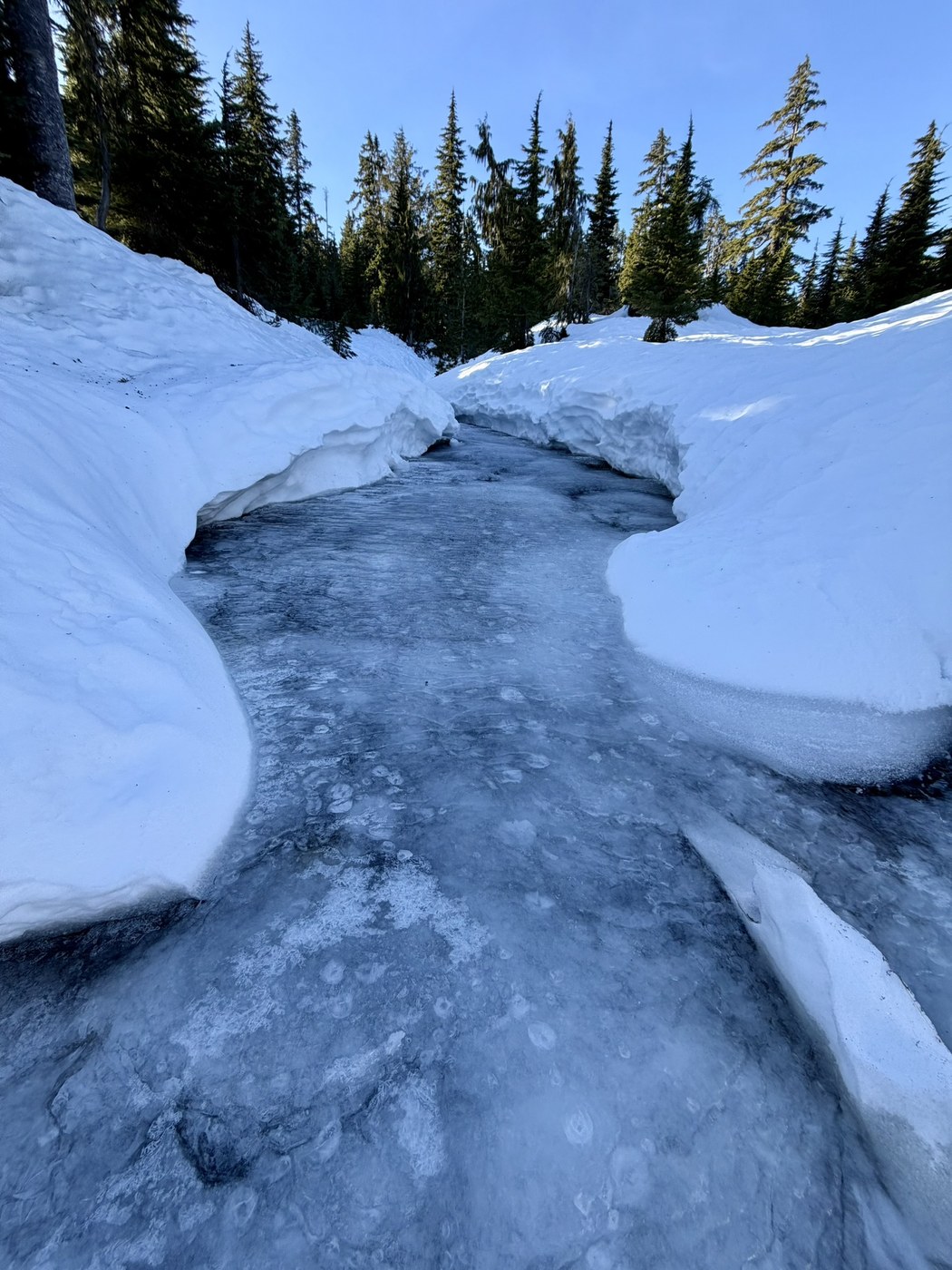 As an fyi, there is one avalanche chute that currently has deep, gaping holes with boulders poking out and water running under the snow. As of today it was easy to get through but if it warms up OR snows a bit to cover the holes it could be quite treacherous, besides any new avalanche dangers.
