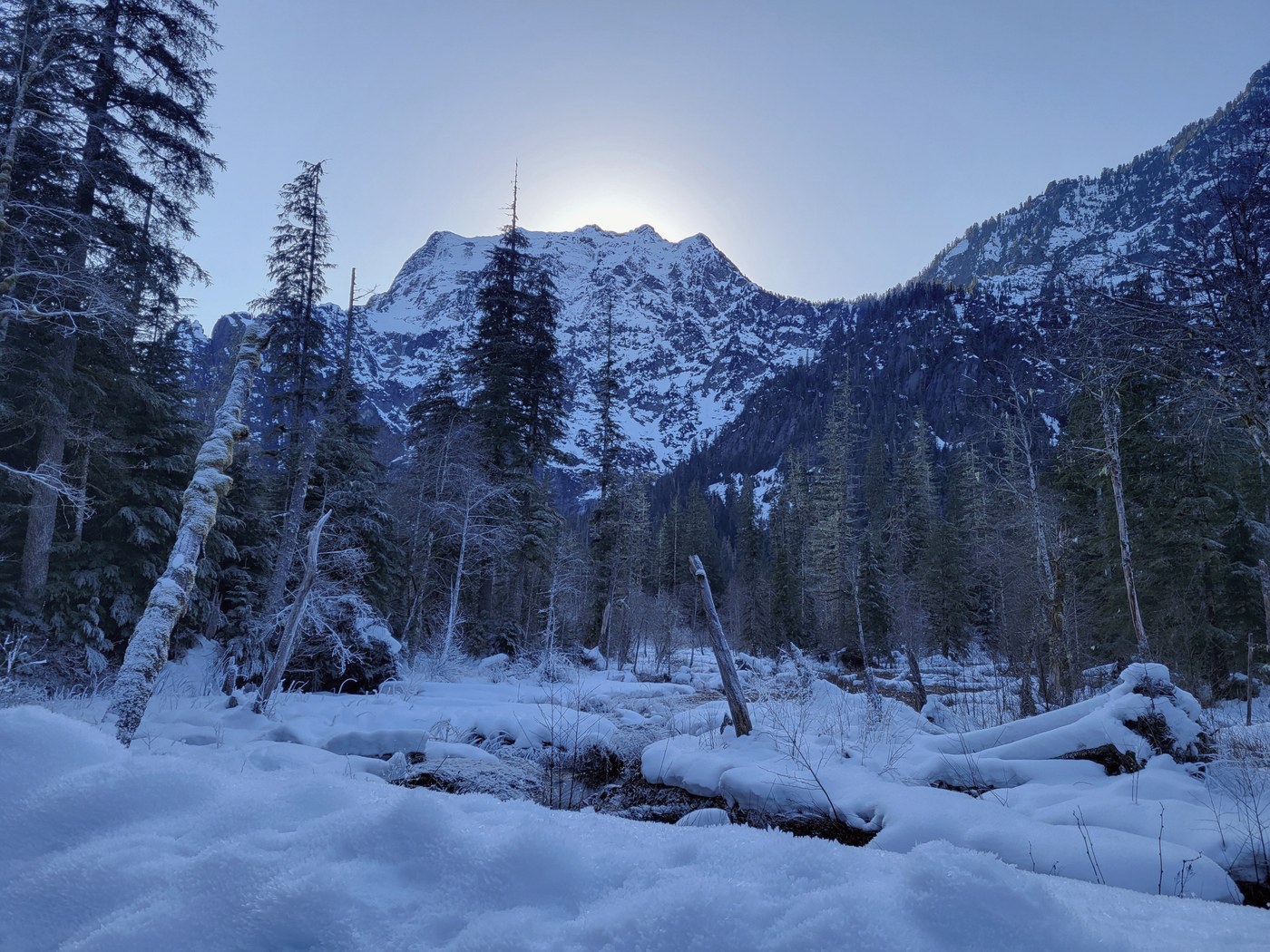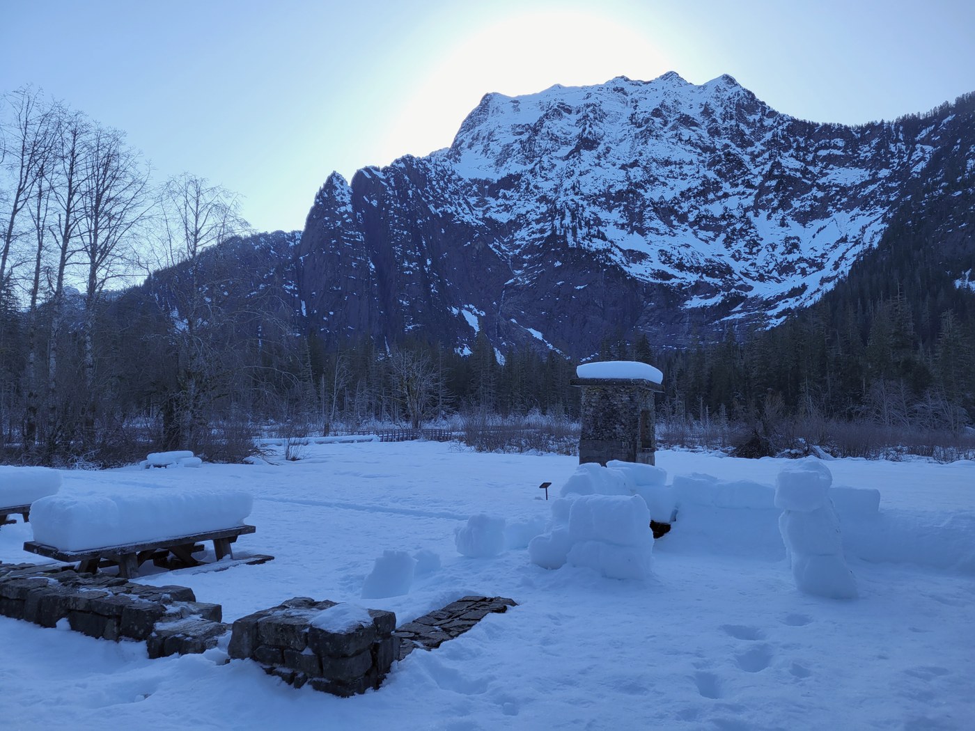The restrooms at the Verlot station are open, clean, and stocked with running hot water in the sinks (at least in the women's side). Mountain Loop Highway has many frosty sections and we felt the car slip three times. Take extra care driving around shaded bends in the road.