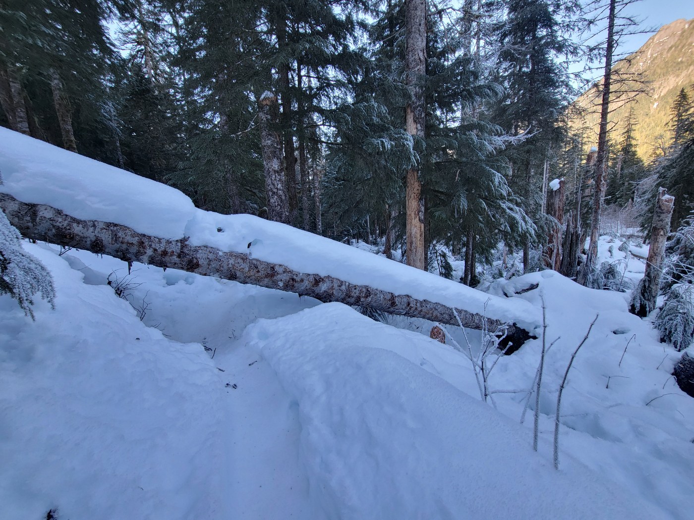 The snow is compact, not fluffy at all, and easy to walk on with spikes. Once you go past the picnic area toward the caves, the path is well-defined through the forest. There are several downed trees to duck under and hop over.
