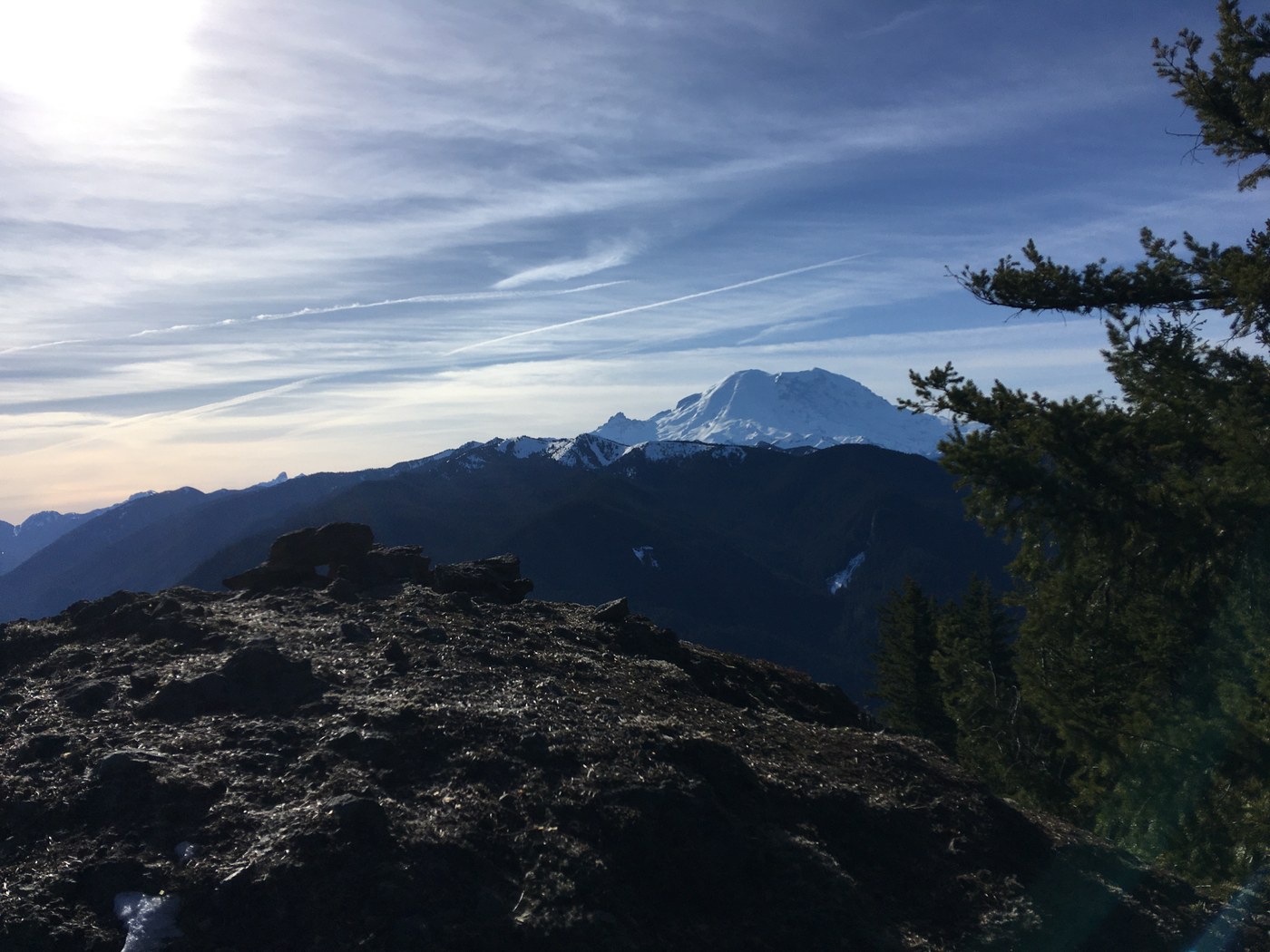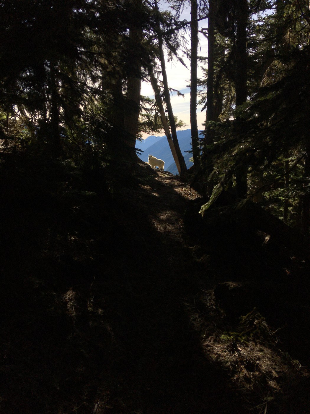 Some other takeaways I can share: First, the Palisades trail is fully snow covered between the junction and about a half mile before Little Ranger Peak. No traction required but gaiters and poles are helpful. Second, there are goats around here! When I was just about to reach the viewpoint off the switchback near the summit, I was greeted with a surprising and curious gaze of one said goat. I backed away to give it space, and when I slowly began making my way to the viewpoint it had disappeared. Third, the summit of Little Ranger Peak is attainable via an easy forested slope scramble and has a register tube. These views were the most clear and expansive of the entire hike.