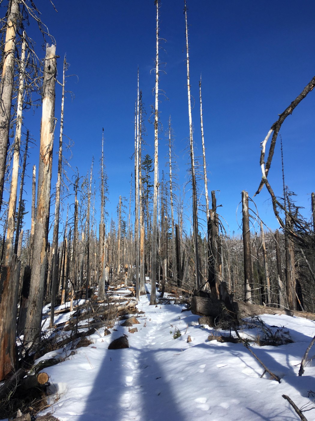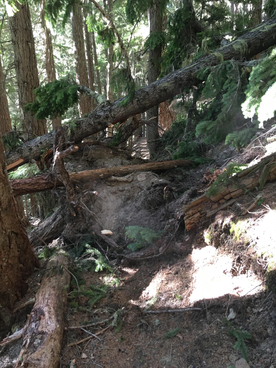 To be clear, not all of these were terribly difficult to get through/around/under/over, and they ranged in size from 6"-24" in diameter. Though they take time to negotiate. Also some were slightly dangerous in terms of stability and stob. And.. one in particular at about 3.8 miles in, which was a bit of a blowdown/rootball combo, had me go sideways after tripping over a sneaky root.