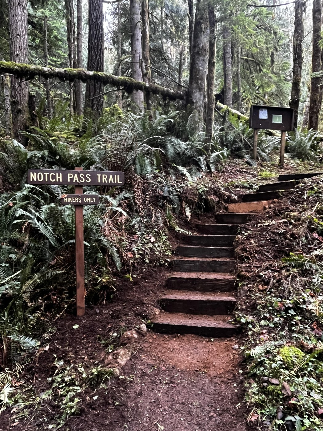 Notch Pass is a lovely trail that WTA worked on yesterday (1/26/26). Our crew focused on rebenching the tread and clearing organics from the trail surface to improve drainage. A previous work party had already brushed back the dense ferns, so we removed the cut vegetation from the trail corridor as well. We also cleared two logs from the trail—one using a crosscut saw and another with an axe since it was rotten and waterlogged.