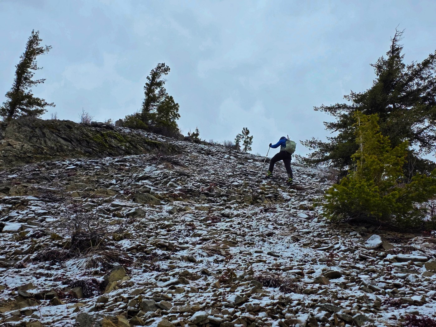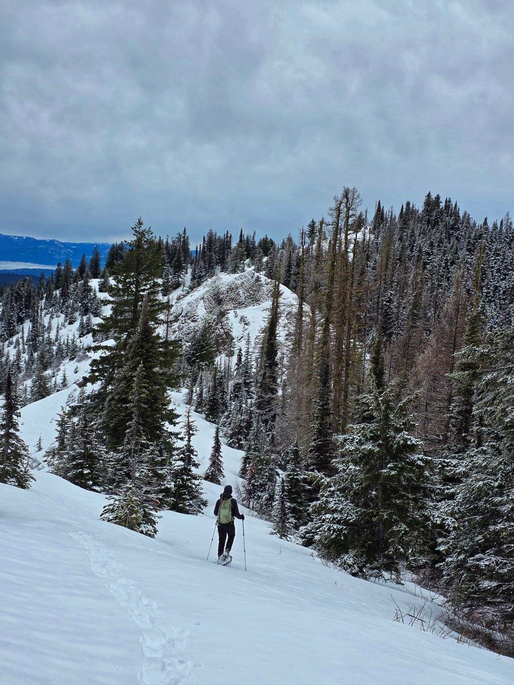 - After a short break, we went straight down the ridge. The idea was to save some distance, but there's a lot of bushwhacking and it was pretty steep with mixed snow conditions. So we decided to ditch our snowshoes, put spikes on and pivot to the summer trail. It was soo much better, albeit a little longer with patchy snow (and some postholing grrr!)