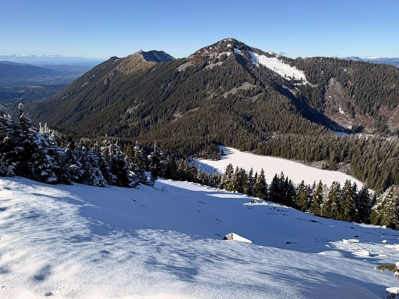 There was a couple of inch of fresh snow in the morning starting at 4000ft. It made the route a bit sketchy. I was planning to traverse from P3 to Defiance but dropped that plan when the snow hadn't melted quickly enough. I went back down with microspikes. The snow coverage was treacherous and required lots of caution.