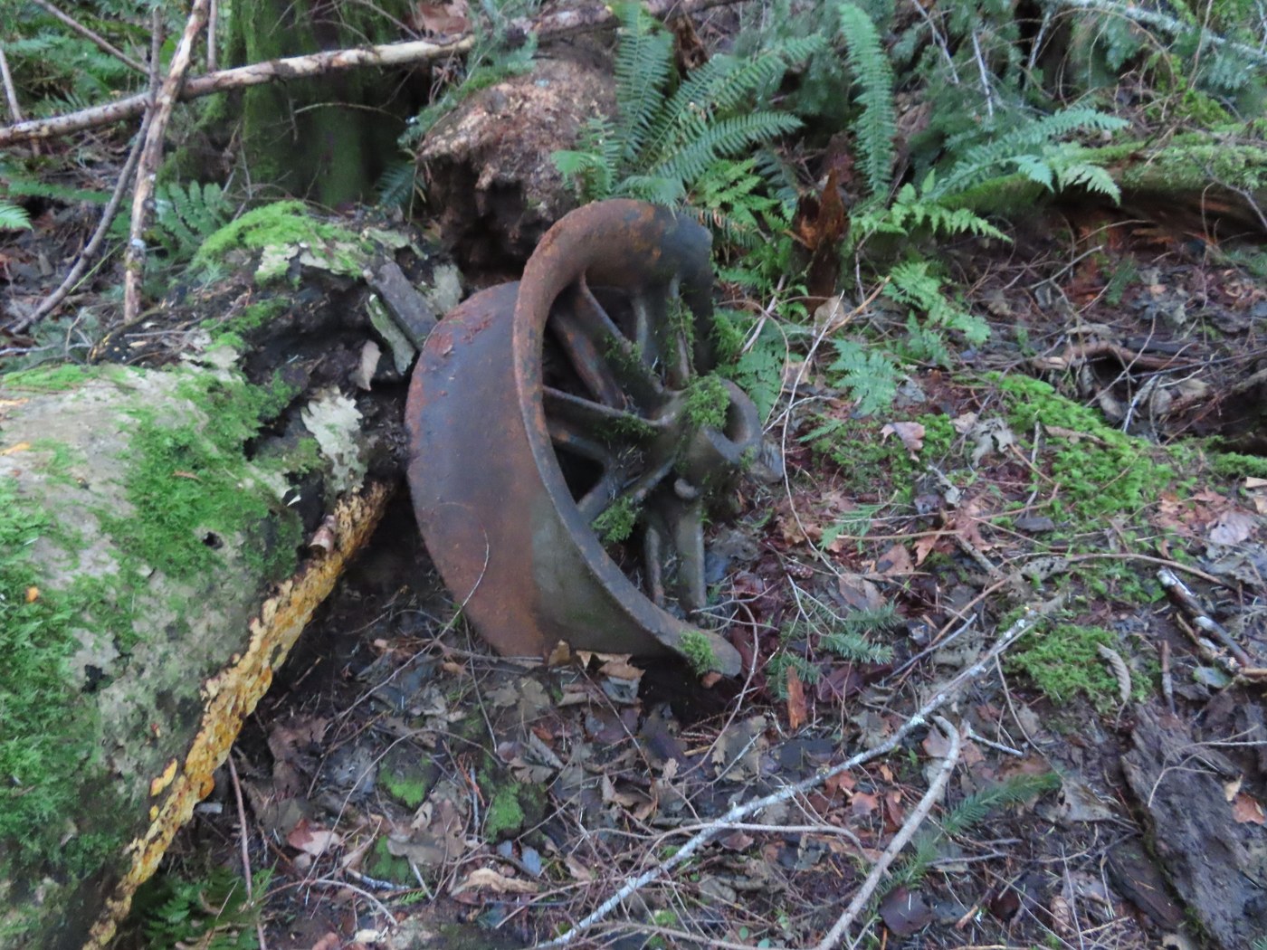 Began my lollipop loop hike from the gate at old Highway 10 near I-90 Exit 20. There were a few other cars already parked nearby. I hiked up the High Point Trail, which is steep in places. When I went under the PSE powerlines, I saw that they had had heavy equipment come through on the powerline road and made a muddy mess for the trail. After passing by the junction for the Dwight's Way Trail, you can see the former roadbed for the "Wooden Pacific" when the High Point Mill Co. was logging the north and west sides of Tiger Mtn. during the steam donkey logging days. Some sections of the trail are on the old roadbed. I then got up to the junction with the TMT and started up hill. When I arrived at a small pond on the west side of the trail I searched around for the remains of the double flanged steel wheel used by the High Point Mill Co. to get their logs down to their sawmill (the sawmill site is now buried under I-90) from the logging railroad grade which is now the West Tiger RR Grade Trail. I found the wheel off the trail SE of the pond. You cannot see it from the trail. The double flanged wheels were used on log cars for a railroad track made of 10"-12" logs for rails.