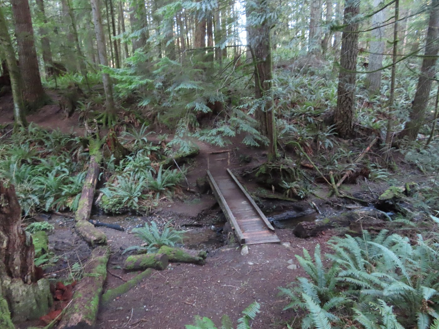 I then continued up the TMT going over the bridge at Ruth's Cove. The area was named for Ruth Ittner who came up with the idea of building a north-south trail through the Tiger Mtn State Forest back in 1972. The trail then levels off for a short distance before getting to a huge old growth Doug Fir stump. Then it is back to going uphill through a couple of switchbacks and coming to the junction with the West Tiger RR Grade Trail. I turned right and headed westbound downhill to get to the old logging railroad grade. This part of the trail is also the TMT.
