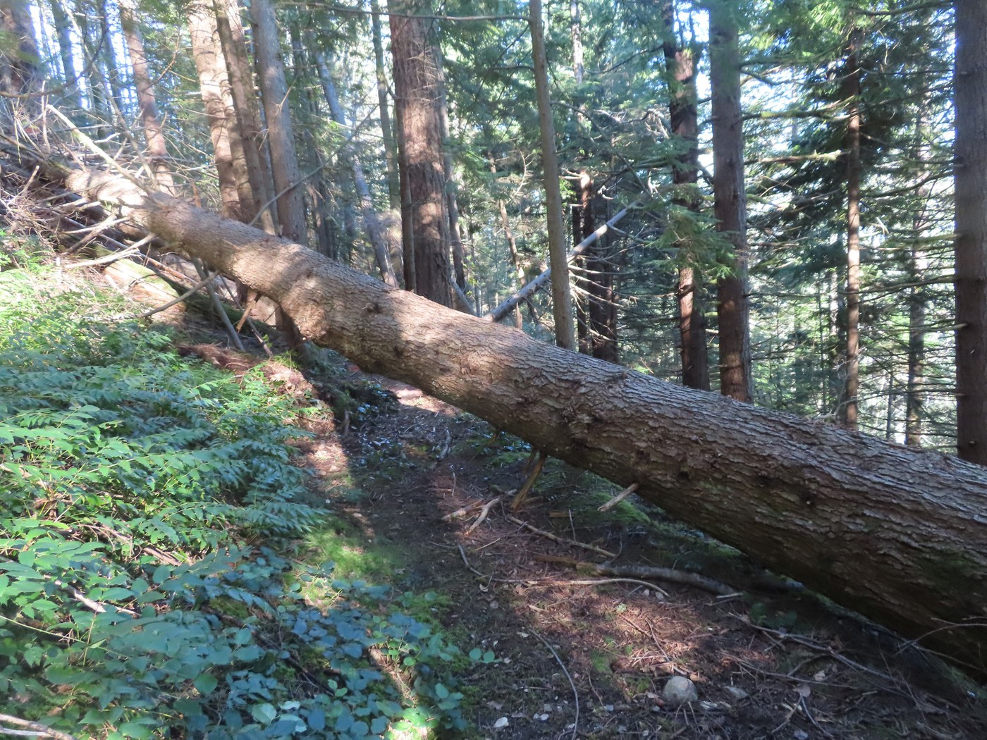 The TMT leaves the old logging railroad grade and heads uphill to get to the junction with the K-3 Trail. Along the way the trail crosses High Point Creek on a large wood bridge. This bridge used to be on the West Tiger RR Grade Trail and was moved up stream to its present location on the TMT. The DNR rerouted the TMT several years ago and closed off part of the West Tiger RR Grade Trail which is now grown over in trees, brush and Devils Club. After crossing the bridge, the TMT goes along a steep side hill in a nice conifer forest area where I could see the Cascade Mountains. I arrived at the junction with the K-3 Trail and the old section of the TMT that meets up with the West Tiger RR Grade Trail. While at the junction I used a fallen tree for my lunch time bench.