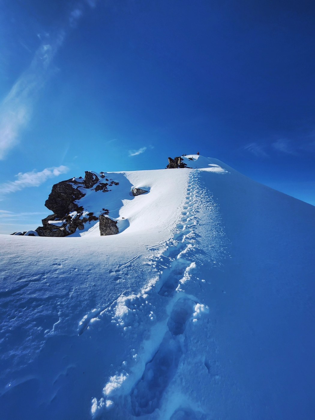 We gained the NE ridge that led us to the summit, picking a much-too-steep spot to climb it on the way up - I switched back to crampons very awkwardly mid-steep slope at this point - but we found a much gentler route on the way down. The final ridge push was in good shape, and took bucket steps well.